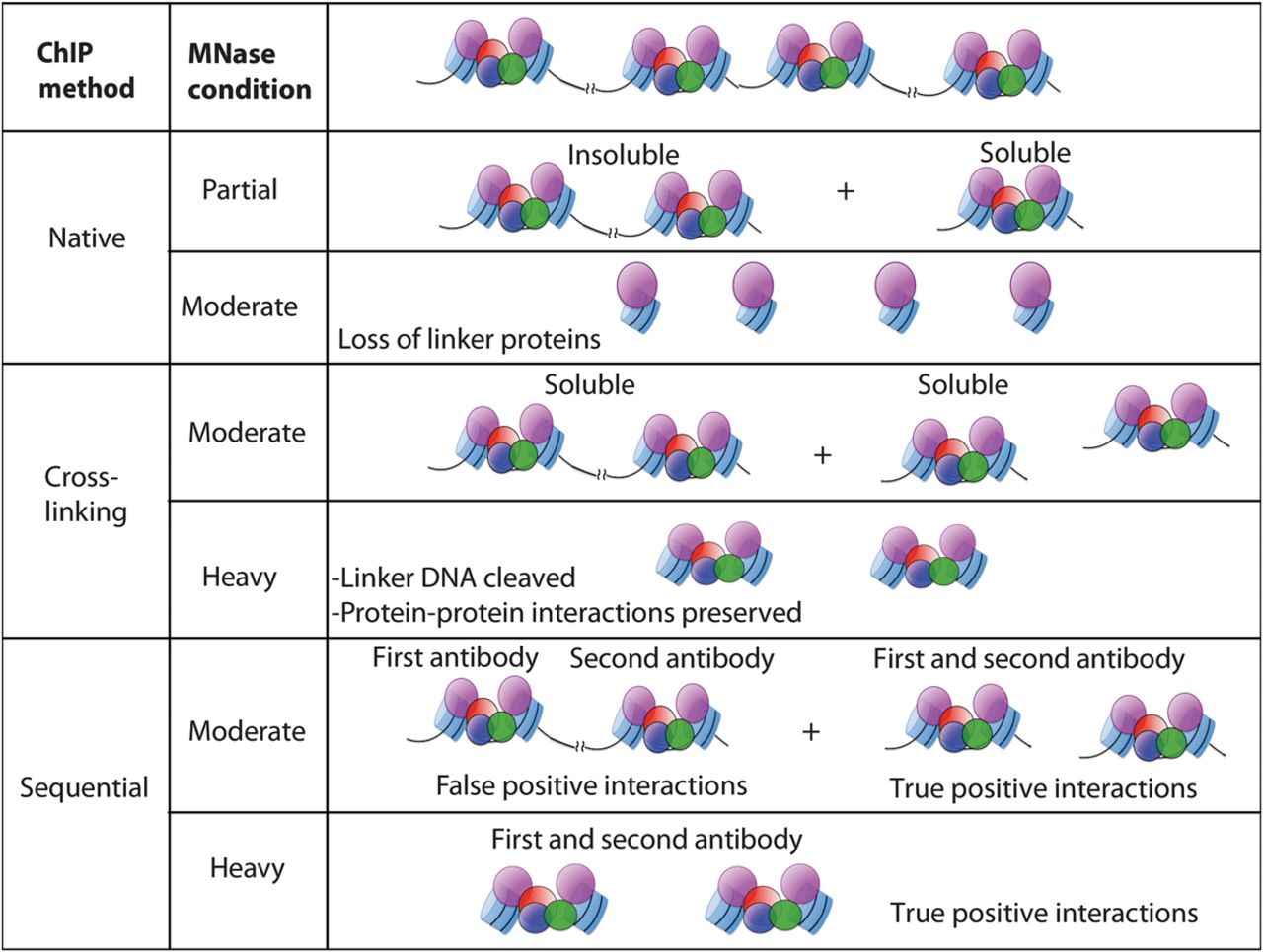 Schematic representation of comparative ChIP methods. Under native conditions, partial MNase digestion produces insoluble chromatin arrays as the major population. Upon moderate MNase digestion under similar conditions, only nucleosomes or similar structures that wrap DNA are protected; and therefore, proteins associated with the linker DNA are lost from the chromatin. In X-ChIP and sequential ChIP, however, protein–protein interactions are stabilized by cross-linking, and the solubility of chromatin is enhanced by detergents, resulting in ChIP signals after both moderate and heavy MNase digestion. In sequential ChIP, false positives can arise from there being multiple complexes pulled down from longer arrays, in which the first antibody pulls down one complex and the second antibody pulls down a different complex: (DNA) black line; (nucleosomes) blue barrels; (DNA-binding proteins) colored balls.