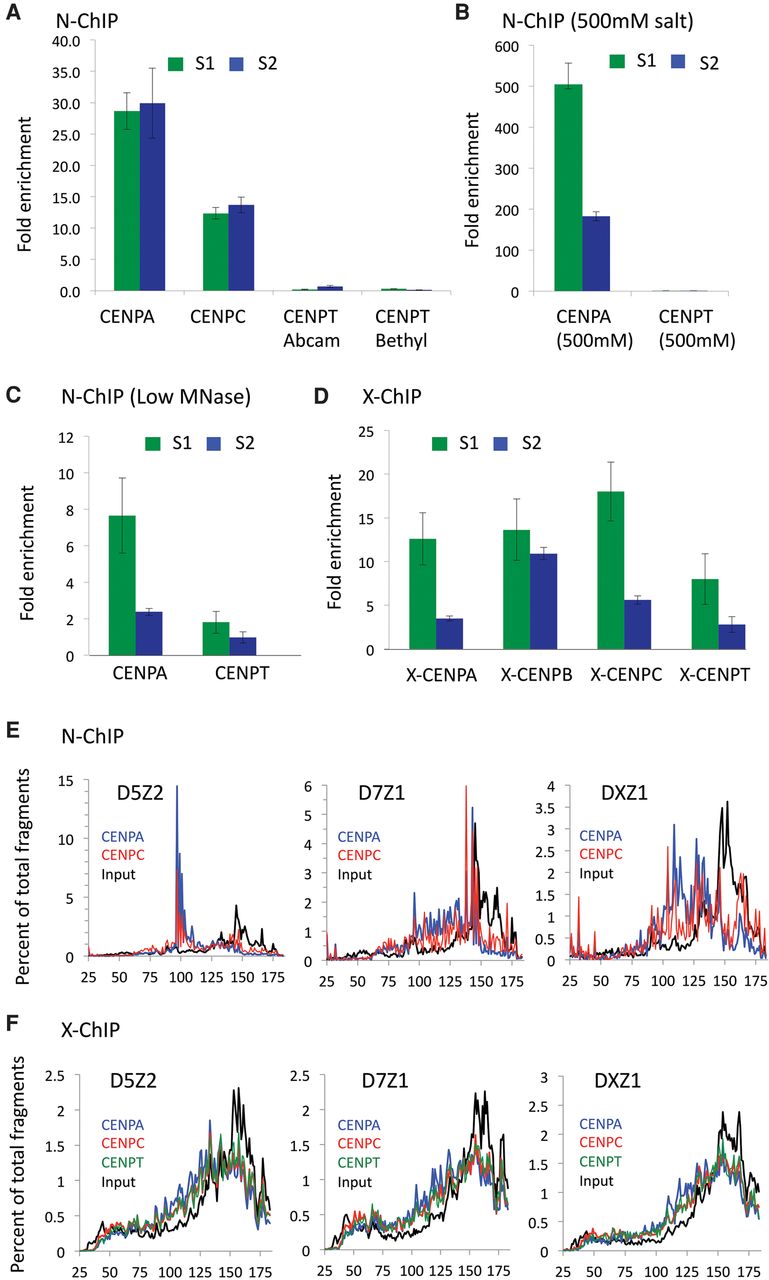 CENPT is not retained at α-satellites by N-ChIP but is retained by X-ChIP. (A) Real-time PCR analysis of DNA obtained by native ChIP of CENPA, CENPC, and CENPT (using two different antibodies). The S1 primer pair was designed from Chromosome 21 alphoid arrays but is also present on Chromosome 13. Primer pair S2 was designed from the Cen1-like (SF1 family) sequences and is also present on Chromosomes 5 and 19 (Supplemental Table 1). Fold-enrichment over input was calculated relative to a control noncentromeric sequence from the 5S rDNA locus: Centromere (ChIP/input) ÷ 5S rDNA (ChIP/input). (B) CENPA and CENPT enrichment from native ChIP assays performed under 500 mM salt conditions. (C) CENPA and CENPT enrichment on DNA obtained from native ChIP assays performed on partially digested chromatin. (D) Enrichment of centromeric sequences in CENPA, CENPC, and CENPT cross-linking ChIP (X-ChIP). (E,F) Fragment length analysis of merged pairs obtained from (E) native or (F) X-ChIP data sets on D5Z2 (left), D7Z1 (middle), and DXZ1 (right) sequences. The sharp reduction in the size distribution above ∼160 bp and truncation at 185 bp is attributable to mapping of only paired-end reads in which the two 100-bp reads in a pair overlapped by 15 bp.