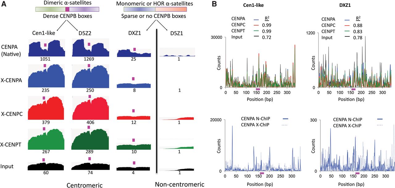 CENPT and CENPC bridge the gap between adjacent CENPA nucleosomes over the CENPB box on young α-satellite dimers. (A) Mapping of X-ChIP merged pairs to previously characterized α-satellite arrays (Hayden et al. 2013; Henikoff et al. 2015). The profiles display normalized counts as described in Methods, in which entire fragments are “stacked,” and for each base-pair position the total number of counts is measured on the y-axis. A single α-satellite dimer from each array is shown. The CENPB box region is indicated by the magenta box. Cen1-like and D5Z2 arrays contain CENPB boxes in every α-satellite dimer (dense) (Henikoff et al. 2015). The DXZ1 tandem array, which is a 12-copy HOR, contains CENPB boxes only in a subset of dimeric units of the array (sparse), and a single CENPB box-containing dimer, which is embedded in α-satellite units that lack a CENPB box, is shown. The D5Z1 array does not contain CENPB boxes. The relative scale is the area of the indicated profile divided by the area of the D5Z1 profile, setting the D5Z1 value to 1, in which the numbers reflect the product of the total sequence abundance and enrichment. For example, Cen1-like is 60-fold enriched in the X-ChIP input, reflecting higher sequence abundance, and 235-fold enriched in CENPA ChIP, which implies that ChIP enrichment per copy is 235/60 or approximately fourfold. Biological replicates using different CENPT antibodies gave nearly identical patterns and relative scale values (Supplemental Fig. S2). (B) Fragment ends from native and X-ChIP data sets were mapped to the Cen1-like consensus and DXZ1 sequences. The CENPB box region is indicated by the magenta box. The top panel shows ends from CENPA, CENPC, CENPT X-ChIP, and input. The bottom panel compares ends of CENPA reads in N-ChIP (solid line) and X-ChIP (dotted line).