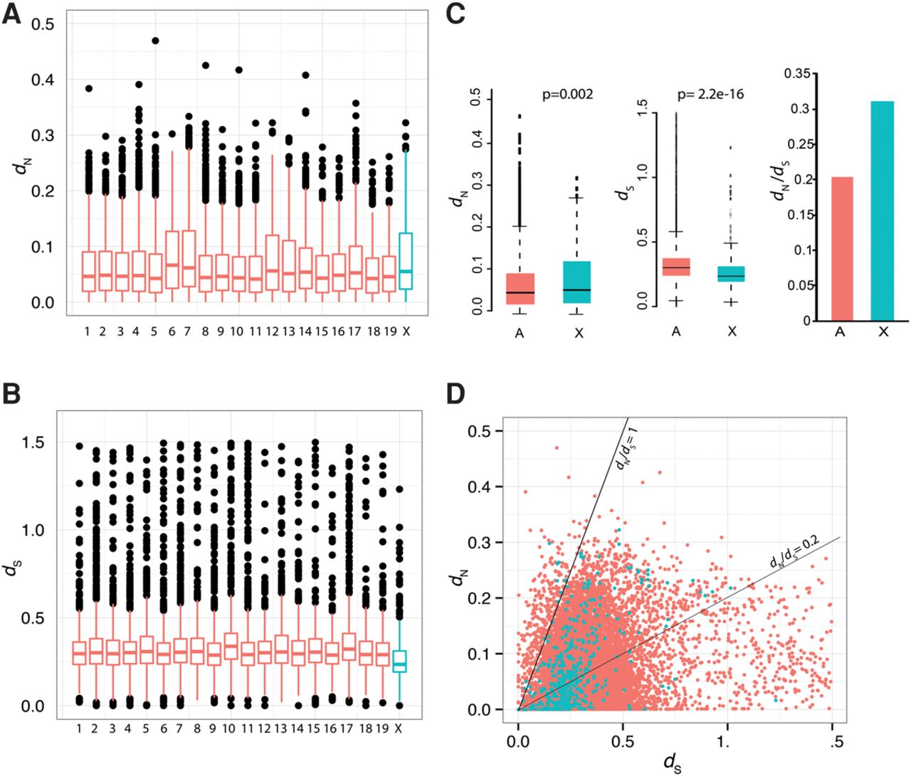 dN and dS analyses of autosomal and X-linked genes in E. lutescens. (A) Boxplots showing dN values of autosomal and X-Chromosomal E. lutescens orthologs of mouse genes. Values were averaged per chromosome and plotted using the mouse chromosomal map. (B) Boxplots showing dS values of autosomal and X-Chromosomal E. lutescens orthologs of mouse genes. Values were averaged per chromosome and plotted using the mouse chromosomal map. (C) Boxplots of dN (left) and dS (middle) values of all autosomal genes together compared with the X Chromosome, and the corresponding dN/dS values for the autosomal genes and the X-linked genes (right), calculated from the summed values. P values were calculated using R (Wilcoxon rank-sum test) and indicate significant differences between autosomal and X-Chromosomal values. (D) Scatter plot showing the distribution of dN and dS for the E. lutescens X Chromosome (green) and autosomes (red).