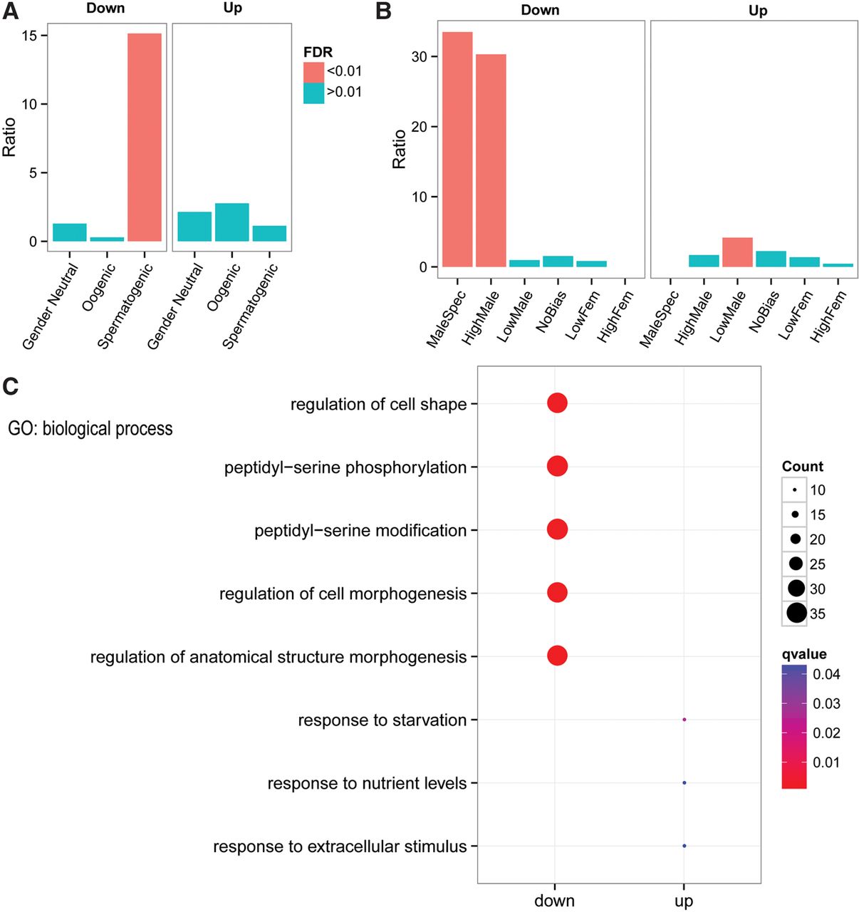 Enrichment analysis of down- or up-regulated genes against sex-biased genes. Analysis was performed separately for down-regulated and up-regulated genes found in both hybrids against the gene categories defined by two previous studies (see text). Note a significant enrichment of spermatogenesis genes (A) or male-specific genes (B) in the down-regulated gene list. “Low male” category also shows a significant enrichment for up-regulated genes, but its ratio is not comparable to those in down-regulated list. (C) Gene ontology analysis of down- or up-regulated genes shared by the two sterile lines.