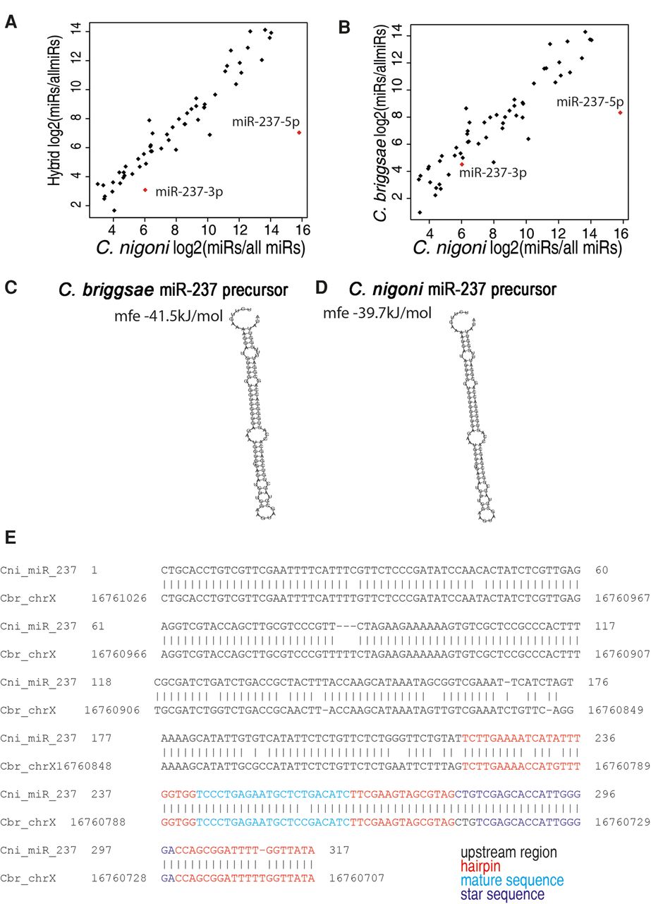miR-237 is differentially expressed between males of ZY10330 and C. nigoni. (A,B) Scatterplots showing miRNA read counts in C. nigoni (x-axis) against either hybrid males (A) or C. briggsae (B). miR-237 mature (5p) and star (3p) are highlighted. (C,D) Secondary structure predictions of the miRNA precursors in C. briggsae and C. nigoni. Predictions were made by RNAfold. (E) Alignment of mir-237 genomic locus in C. briggsae and C. nigoni showing some sequence divergence in the putative promoter region.