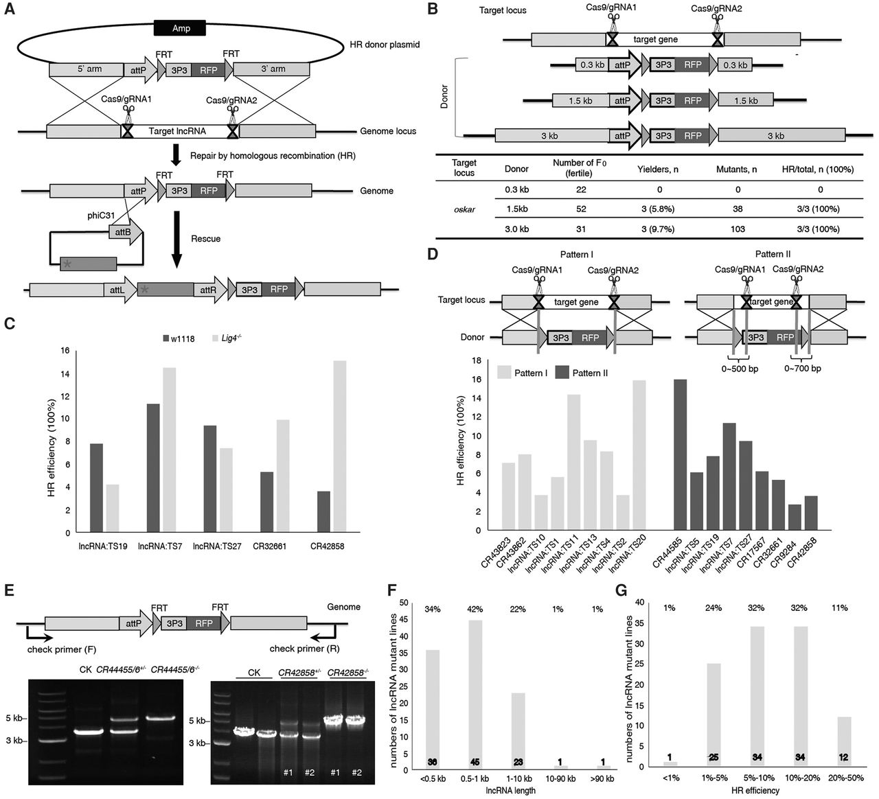 CRISPR/Cas9-mediated high-throughput mutagenesis of 105 lncRNAs. (A) Schematic representation of the strategy for generating lncRNA knockout and rescue lines using CRISPR. (B) Determination of the optimal HR donor length for efficient gene replacement. The plasmid containing a reporter cassette (attP-FRT-3P3-RFP) flanked by 0.3, 1.5, and 3 kb HR sequences was provided as the donor DNA. The oskar gene was used to test the system. (C) DNA Ligase4 deficiency had no dramatic effect on HR efficiency at different target loci. (D) Within a range of 0–700 bp, the distance between the double-strand break site and the homology arm had no dramatic effect on HR frequency. (E) Genotyping of w1118, lncRNA+/−, and lncRNA−/− flies to confirm lncRNA knockouts. Insertion of the reporter cassette results in a size increase in the PCR products, which is visualized only in heterozygous and homozygous flies. (F) Length distribution of the targeted lncRNAs. (G) The distribution of HR efficiency when generating the 105 lncRNA mutants using CRISPR. F0 injected flies were crossed to w1118, and their progeny were screened for RFP-positive eyes. Crosses producing one or more transgenic progeny were considered as founder lines. The homologous recombination efficiency was calculated as the ratio between the number of founder lines and the number of F0 crosses.