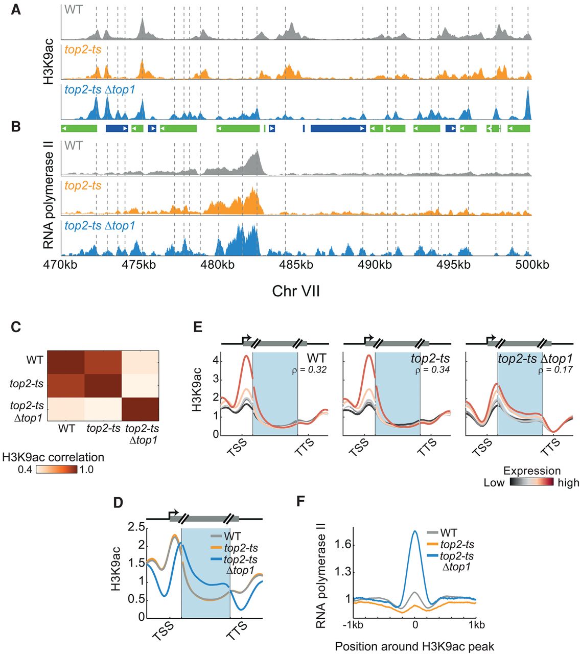Replication-independent effects of topoisomerase depletion on H3K9ac and RNA polymerase II. (A,B) Colocalization of RNA polymerase II with replication-independent H3K9ac peaks. H3K9ac levels (A) and RNA pol II binding (B) in synchronized cells. Dashed lines highlight peaks of H3K9ac in the top2-tsΔtop1 strain. Gene positions are depicted in the center, as in Figure 6C (inset). (C) Topoisomerase depletion modifies the genome-wide H3K9ac pattern. The genome-wide correlations between H3K9ac in synchronized cells of the indicated strains. (D) Shift in H3K9ac upon depletion of topoisomerases. Metagene analysis of H3K9ac (as in Fig. 1C) for the indicated strains. (E) Shift in H3K9ac is associated with gene expression levels. Metagene analysis of H3K9ac for genes grouped according to their expression levels (as in Fig. 5B). Expression levels as measured in the relevant strain at the synchronized time-point. Correlation values (ρ) between gene average H3K9ac and gene expression levels are indicated. (F) H3K9ac colocalizes with RNA pol II. Peaks in H3K9ac were identified, the respective regions were aligned by the maximal H3K9ac signal, and the average RNA pol II measured over the aligned regions was plotted.