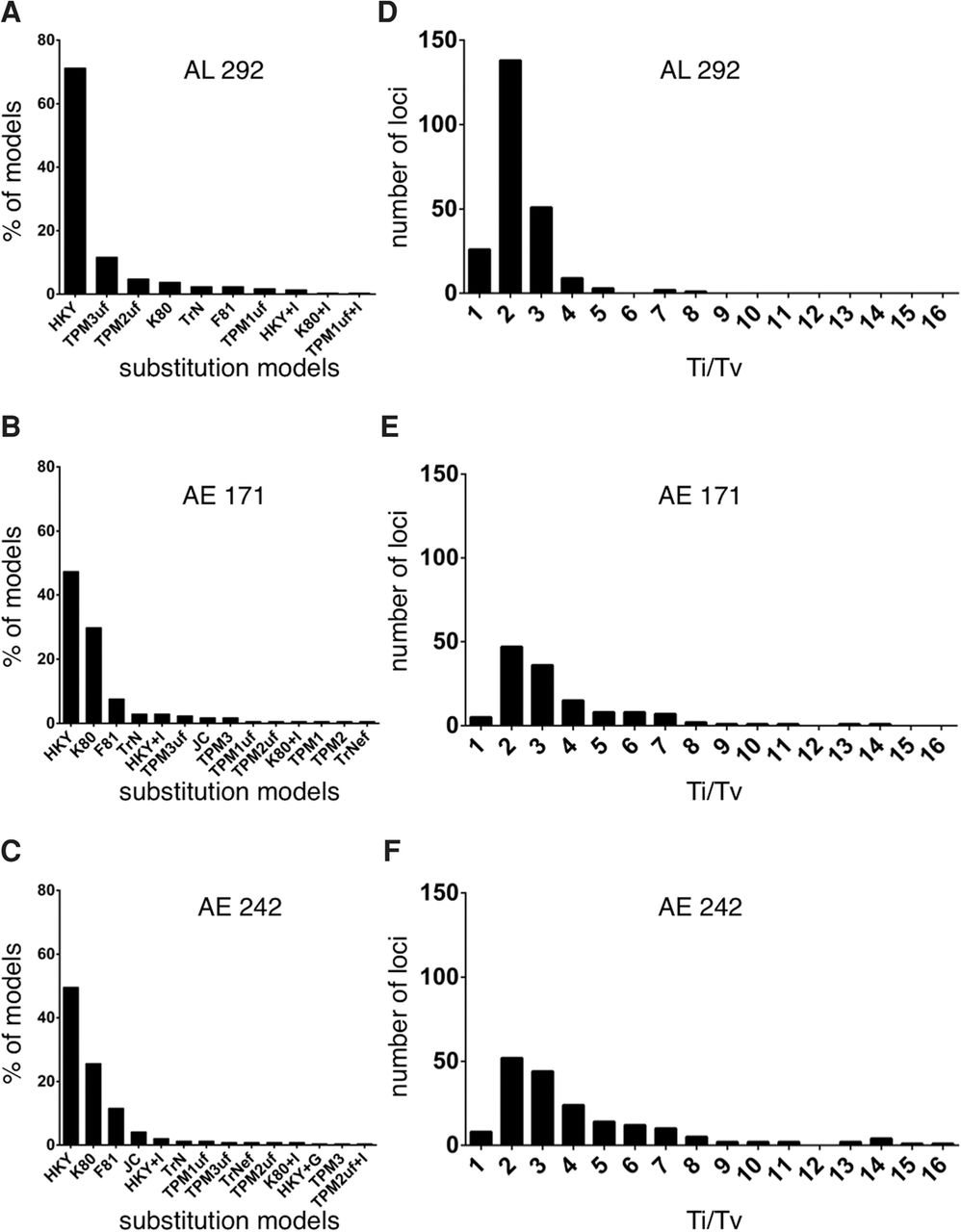 Mutational profiles observed in three phylogenomic data sets obtained from human, chimpanzee, gorilla, and orangutan genomes. The data sets include 292 AL, 171 anchored enrichment (AE) loci, and 242 AE loci (for descriptions of each data set, see main text). (A–C) Distributions of nucleotide substitution models for each data set (for details about the different models, see Posada 2008). (D–F) Distributions of transition/transversion (Ti/Tv) rate ratios for each data set. Note, Ti/Tv values are only shown for loci that had a best-fitting nucleotide substitution model containing this parameter (i.e., 185, 133, and 230 loci, respectively). Also, five of the 171 AE loci and six of the 242 AE loci exhibited unusually high Ti/Tv values and thus were not included in these analyses. Source data are in Supplemental Tables S3 through S5.