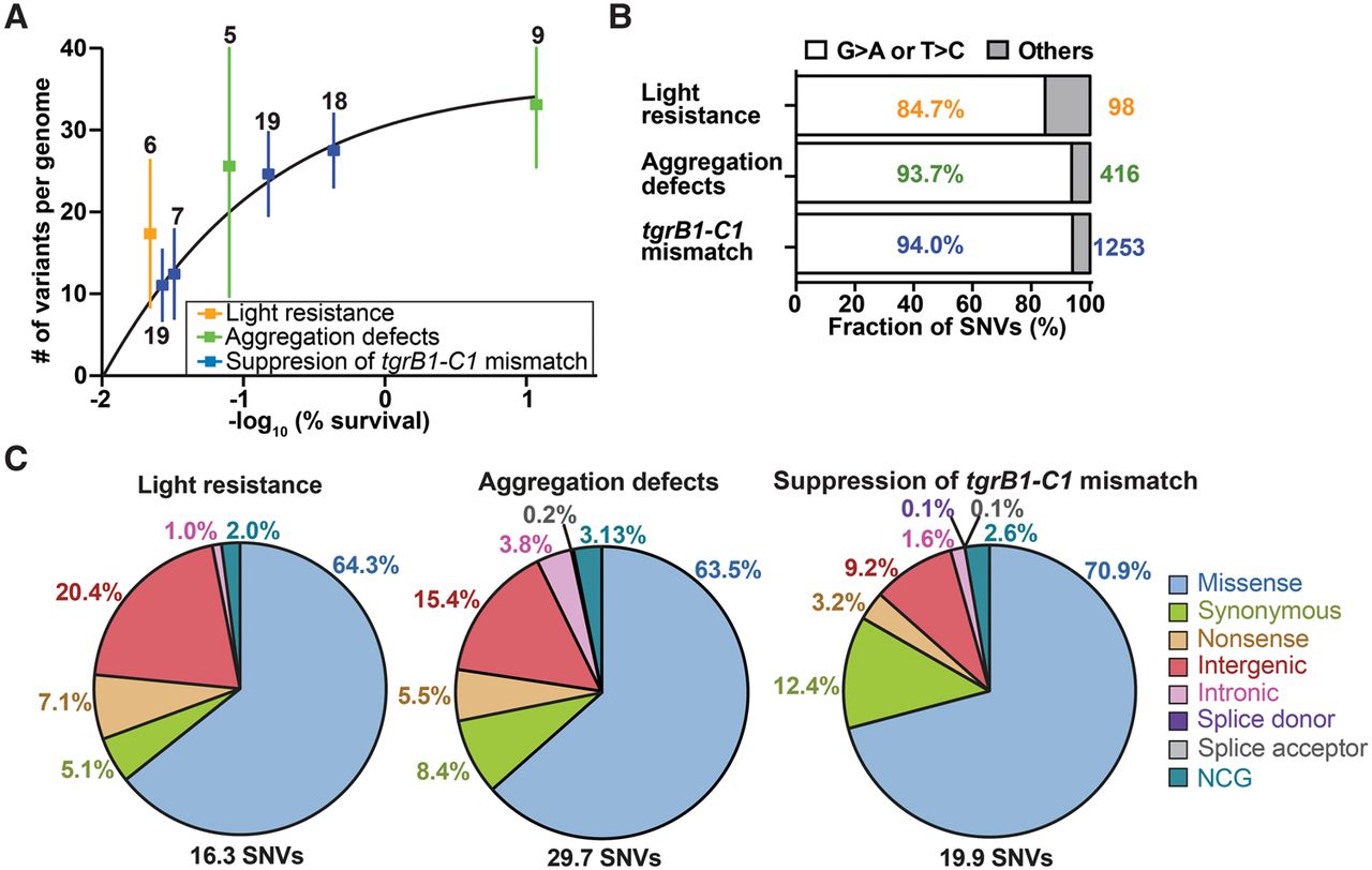 Properties of the chemically induced mutations. (A) We plotted the number of mutations (single nucleotide variants and indels) per genome (y-axis) against the negative logarithm of survival (%, x-axis). Dots represent means and whiskers represent 95% confidence intervals. Sample sizes are indicated next to each whisker, and the framed legend describes the experiments. (B) The bars show the proportion of filtered single nucleotide variants (SNVs) that are G > A or T > C transitions in individual experiments (white) and the other substitutions (gray). Percentages of G > A or T > C transitions are indicated inside the bars. The total numbers of filtered SNVs are indicated on the right. Sample size: light resistance (n = 6), aggregation defects (n = 14), and tgrB1-C1 mismatch (n = 63). (C) SNVs were classified into eight groups based on the locations and types of substitution mutations (missense, synonymous, nonsense, intergenic, intronic [excluding splice sites], splice donor site, splice acceptor site, and NCG [noncoding gene], as indicated on the right). Titles above the pie charts describe the experiments. The average number of SNVs per genome is indicated on the bottom. The percentages of individual mutation types are indicated next to individual sectors.