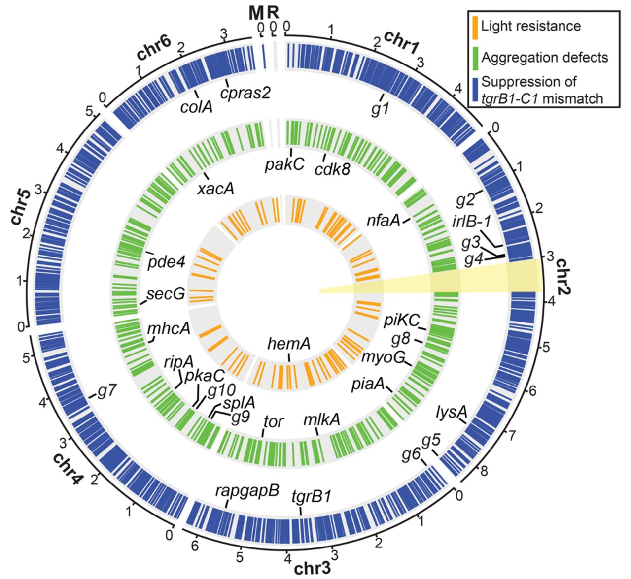 The genomic distribution of chemically induced mutations. The circular plot summarizes the distribution of chemically induced mutations in the six chromosomal (Chr 1–6), mitochondrial (M), and ribosomal (R) DNAs. Colored bars on the three concentric circles represent the mutations found in the three genetic screens as indicated in the legend: suppression of the tgrB1-C1 mismatch (blue, n = 63 strains), aggregation defects (green, n = 14 strains), and light resistance (orange, n = 6 strains). The candidate genes in the individual screens are labeled inside the respective circles, and the black lines indicate their chromosomal positions. Abbreviations: g1, DDB_G0270488; g2, DDB_G0271904; g3, DDB_G0273247; g4, DDB_G0273385; g5, DDB_G0277749; g6, DDB_G0277997; g7, DDB_G0285705; g8, DDB_G0275861; g9, DDB_G0283339; g10, DDB_G0283893. The yellow sector (around 3 o'clock) indicates the second copy of the Chromosome 2 duplication (Chr 2: 3016083…3768654), which was masked during the alignment of sequencing reads. The full list of mutations is detailed in Supplemental Data 1–3 and the candidate genes in Supplemental Table S1. The scale outside the circles shows positions in million base pairs (Mb).