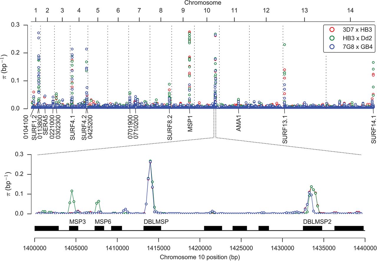 Variation in nucleotide diversity over the core genome. Nucleotide diversity is shown for each cross in 500-bp half-overlapping windows across the core genome (which excludes hypervariable regions containing var, rif, or stevor genes) using SNPs combined from both variant calling methods and passing all quality filters. The peak of nucleotide diversity on Chromosome 10 is expanded to show four distinct peaks due to genes encoding merozoite surface antigens MSP3, MSP6, DBLMSP, and DBLMSP2. All labeled loci (with the exception of AMA1) are sites of complex variation where assembly of sequence reads is required to determine the nonreference alleles.