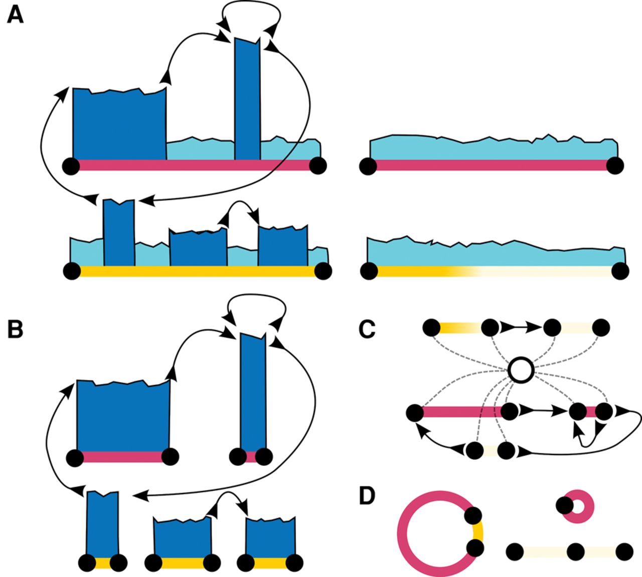 Overview of CouGaR algorithm. Tumor and normal samples are processed through a five-step algorithm. (A) We identify regions that are potentially amplified (dark blue) across two different chromosomes (red and yellow lines) in the tumor samples (left two contigs) compared to normal samples (right two contigs). We compute depth of coverage (DOC) information and cluster discordant read pairs to represent novel (with respect to hg19) adjacencies in the genome. (B) We identify continuous regions of amplification in the tumor genome using an HMM and DOC information from both tumor and normal samples. (C) We add a single super-source/-sink node, and using a min-cost circulation algorithm, we solve for the copy count of each region in the tumor genome. (D) Finally, a minimal set of circular and linear contigs that explain the coverage is found by formulating an integer programming problem that puts a penalty term on the number of unique contigs used.