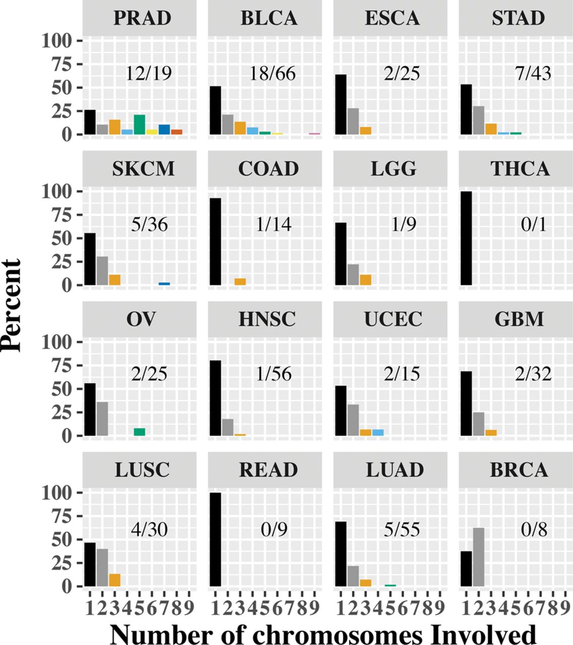 Distribution of multichromosome contigs. For each of the tumor types, we looked at the chromosomes that each of the contigs span and binned each sample based on the most chromosomes spanned by any contig. In the bar chart, we show the percentage of samples based on the contig with the largest number of chromosomes (1–9). For each cancer type, we also report as a fraction the number of samples with a contig spanning three or more chromosomes. We notice that prostate (PRAD) and bladder (BLCA) cancers have a high occurrence of multichromosome contigs. On the other end of the spectrum are colon (COAD) and rectal (READ) cancers, with most contigs contained in one chromosome.