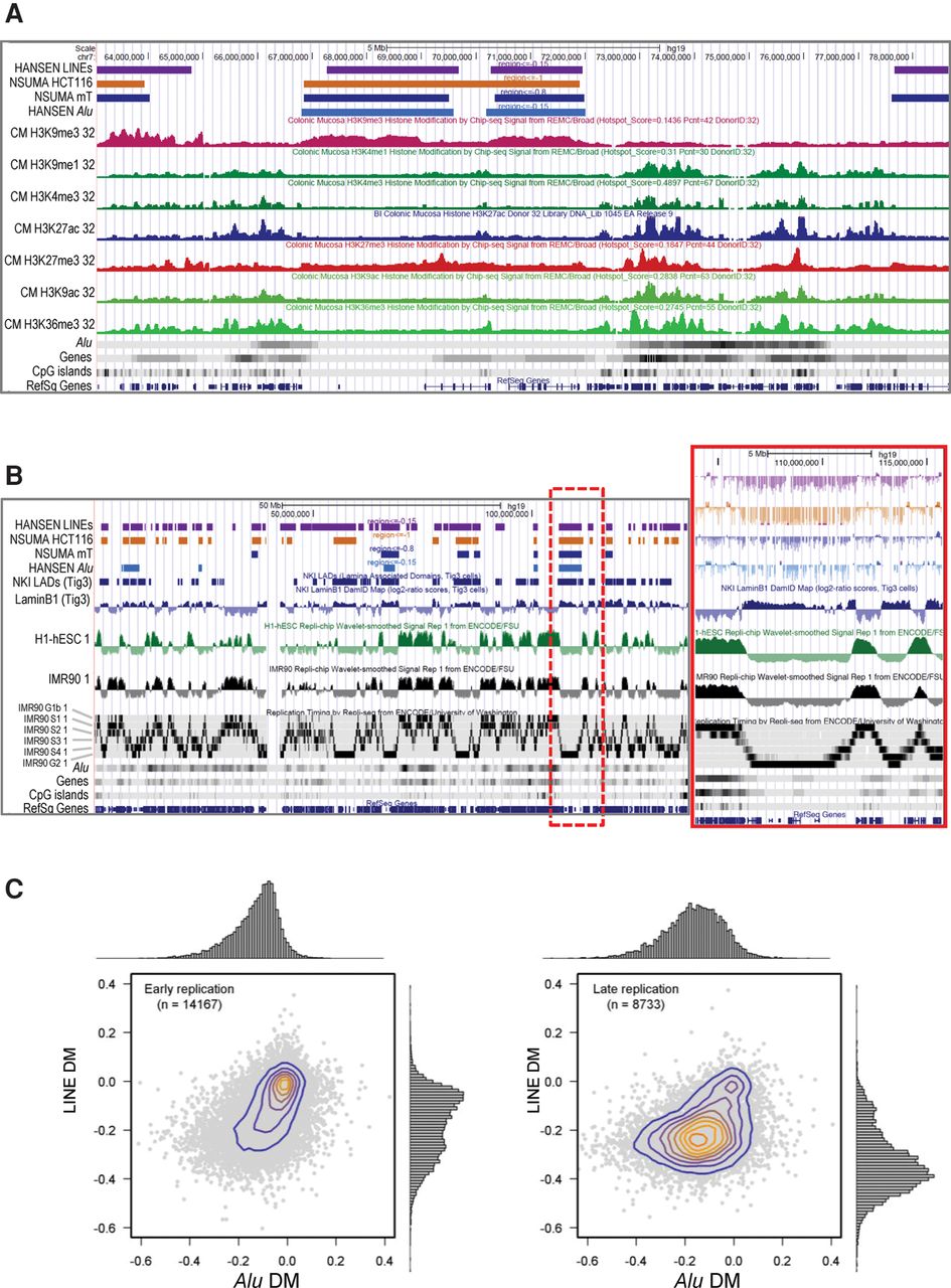 (A) Relationships in the genomic distribution of colon cancer DNA hypomethylation and histone modification profiles of normal human colonic mucosa. Data have been displayed using the UCSC Genome Browser and represent (from top to bottom): the hypomethylated regions for LINEs analyzed by WGBS in three colorectal carcinomas, for Alu repeats analyzed by NSUMA in three colorectal carcinomas, for Alu repeats analyzed by NSUMA in HCT116 cell line, for Alu repeats analyzed by WGBS in three colorectal carcinomas, and the histone modification profiles for human colonic mucosa produced by the Roadmap Epigenomics Consortium. (B) Distribution of colon cancer hypomethylated regions concurs with nuclear lamina associated domains and late DNA replication. The inset shows a detailed view of genomic elements in the region enclosed by a red dotted line. (C) Alu and LINE differential methylation in colorectal cancer in relation to replication timing in IMR90 cells. Each dot represents a region of 100 kb.