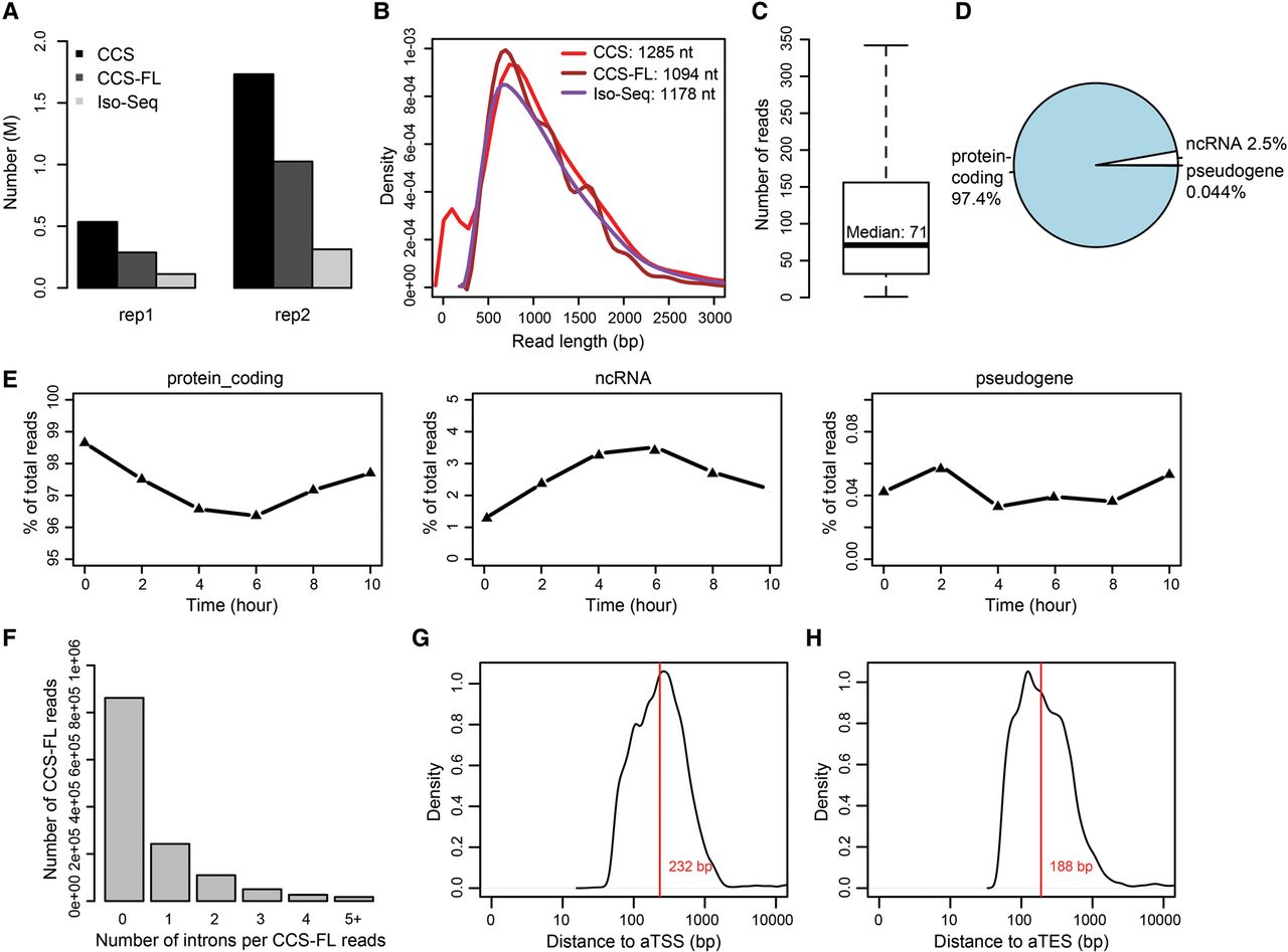 General properties of PacBio reads. (A) Numbers of CCS reads, full-length CCS reads (CCS-FL), and Iso-Seq reads from two replicates. The second batch has 4× size of the first batch. (B) Length distribution of CCS, CCS-FL, and Iso-Seq reads. (C) Box plot showing the 25th, 50th, and 75th percentiles of the numbers of FL CCS reads for each gene. Whiskers represent 1.5 inter-quartile range. (D) Pie plot showing the percentage of FL CCS reads corresponding to protein-coding genes, noncoding RNA genes, and pseudogenes. (E) Overall trends of FL CCS reads matching protein-coding genes, noncoding RNA genes, and pseudogenes. (F) Counts of FL CCS reads with different numbers of introns. (G) Distribution of distances between the 5′ end of reads to the annotated TSS sites (aTSSs). Reads only outside the annotated TSS sites were counted. (H) Distribution of distances between the 3′ end of reads to the annotated TES sites (aTESs). Reads only outside the annotated TES sites were counted.