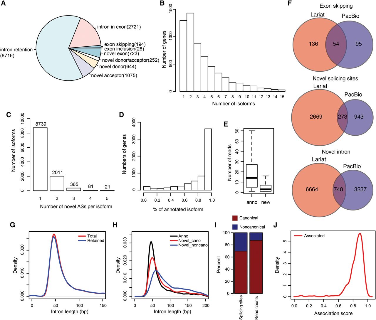 Landscape of alternative splicing events during S. pombe meiosis. (A) Pie chart showing the fraction of different types of alternative splicing events in S. pombe. Numbers of alternative splicing for each type are listed after the names. (B) Count of genes with different number of isoforms. (C) Isoforms broken up by the number of novel alternative splicing events discovered in individual isoforms. (D) Genes broken up by the percentage of FL CCS reads corresponding to the annotated isoforms. (E) Box plot showing the numbers of FL CCS reads supporting annotated and novel antisense transcripts. (F) Venn graphs showing the comparison between AS events detected by PacBio sequencing and lariat sequencing. (G) Length distribution of all annotated introns and of retained introns. (H) Length distribution of annotated introns, novel introns with canonical splicing sites, and novel introns with noncanonical splicing sites. (I) Fractions of canonical and noncanonical splicing sites (left) and of their supporting read counts (right). (J) Distribution of intra-genic association score for alternative intron pairs at FDR = 0.05.
