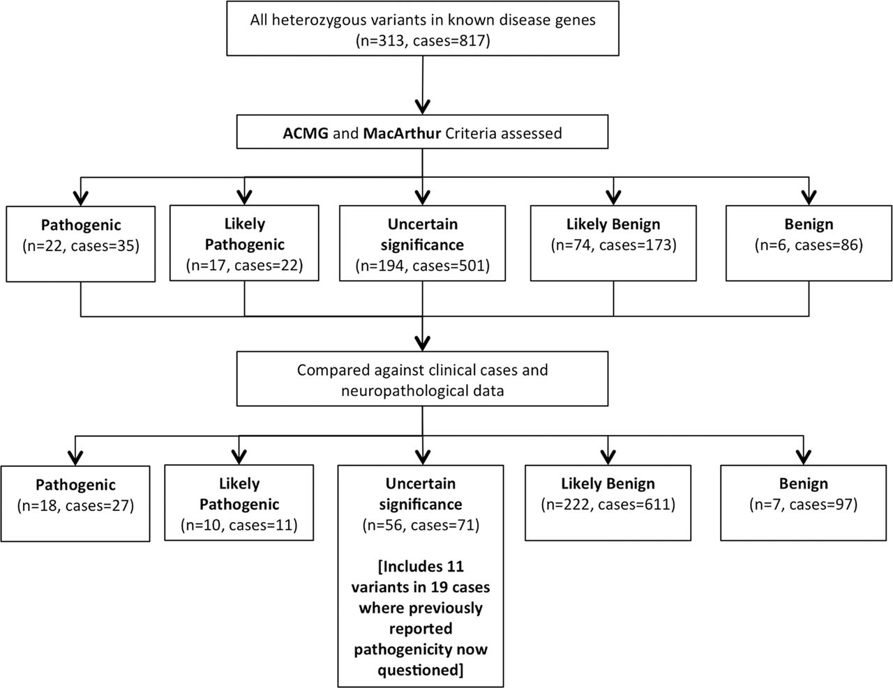 Exome sequencing in 1461 postmortem brains. Assessment of heterozygous variants in genes known to cause familial forms of neurodegenerative disease. All variants were initially assessed against the American College of Medical Genetics (ACMG) criteria and all evidence relating to pathogenicity was recorded according to the guidelines of MacArthur et al. (2014). Comparing variants to clinical and neuropathological data in their respective cases enabled a significant refinement of likely pathogenicity and, in particular, an increase in the number of variants likely to be benign, allowing the reclassification of previous variants considered pathogenic.