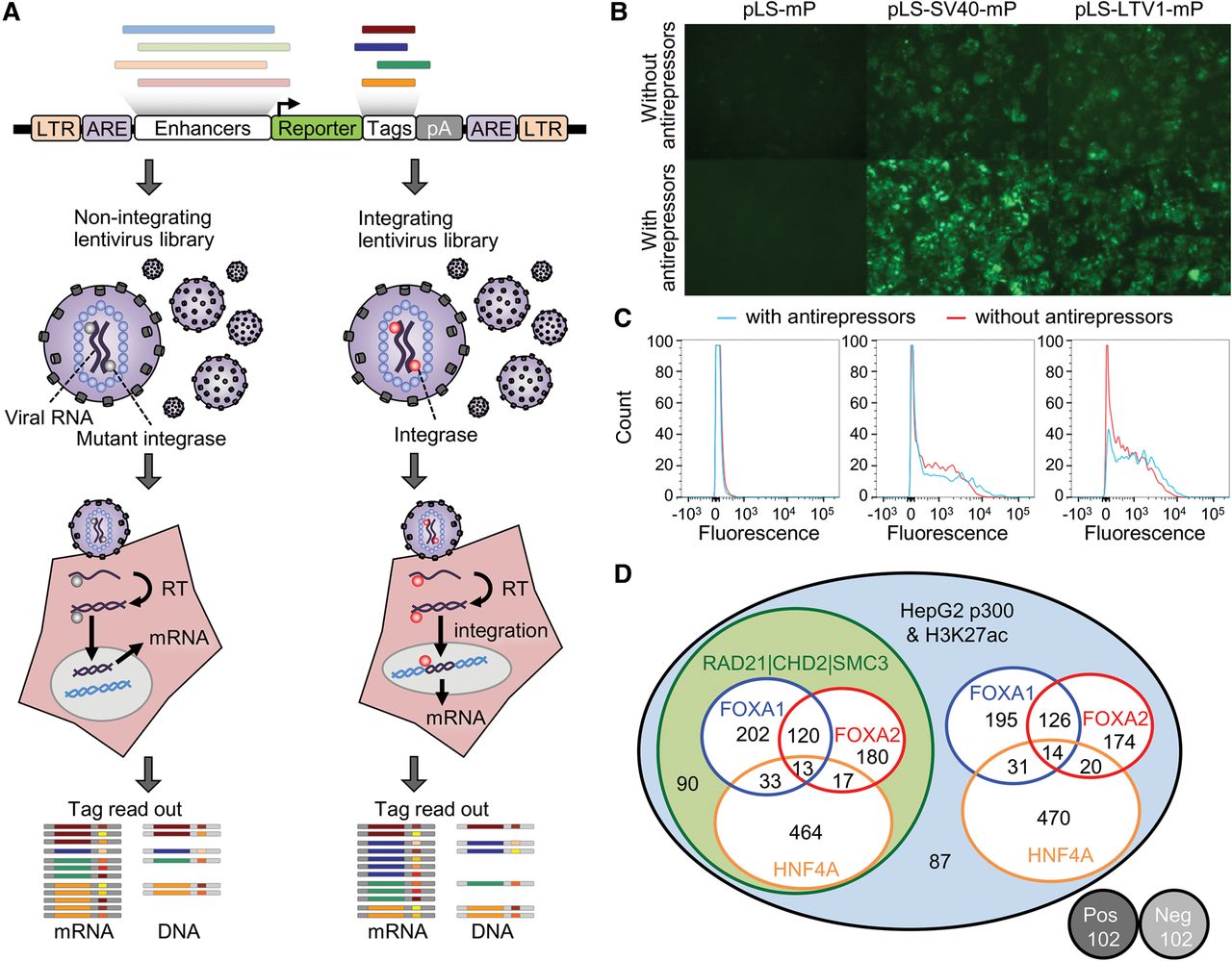Study design for lentiMPRA. (A) Schematic diagram of lentiMPRA. Candidate enhancers and barcode tags were synthesized in tandem as a microarray-derived oligonucleotide library and cloned into the pLS-mP vector, followed by cloning of a minimal promoter (mP) and reporter (EGFP) between them. The resulting lentiMPRA library was packaged with either wild-type or mutant integrase and infected into HepG2 cells. Both DNA and mRNA were extracted, and the barcode tags were sequenced to test their enhancer activities in an episomal versus genome integrating manner. (B) HepG2 cells infected with lentiviral reporter construct bearing no enhancer (pLS-mP), an SV40 enhancer (pLS-SV40-mP), or Ltv1 (pLS-Ltv1-mP), a known liver enhancer (Patwardhan et al. 2012), with or without antirepressors. The inclusion of antirepressors results in stronger and more consistent expression, but is still dependent on the presence of an enhancer. (C) FACS analyses quantifying the fluorescence intensity of pLS-mP, pLS-SV40-mP, and pLS-Ltv1-mP with (blue lines) or without (red lines) antirepressors following infection into HepG2 with 1 copy of viral molecule per cell. Analysis of all GFP expressing cells (fluorescence more than 500 intensity units) shows a higher proportion of cells that strongly express GFP (more than 2000 units) when antirepressors are included. Specifically, 54.8% versus 45.1% for SV40, and 35.6% versus 29.0% for Ltv1, of cells with and without antirepressors, respectively. (D) Venn diagram showing the composition of the lentiMPRA library. Two thousand two hundred thirty-six enhancer candidate sequences were chosen on the basis of having ENCODE HepG2 ChIP-seq peaks for EP300 and H3K27ac marks. The candidates overlapped with or without ChIP-seq peaks for FOXA1, FOXA2, or HNF4A. Half the candidates overlapped with ChIP-seq peaks for RAD21, SMC3, and CHD2. In addition, the library included 102 positive and 102 negative controls.