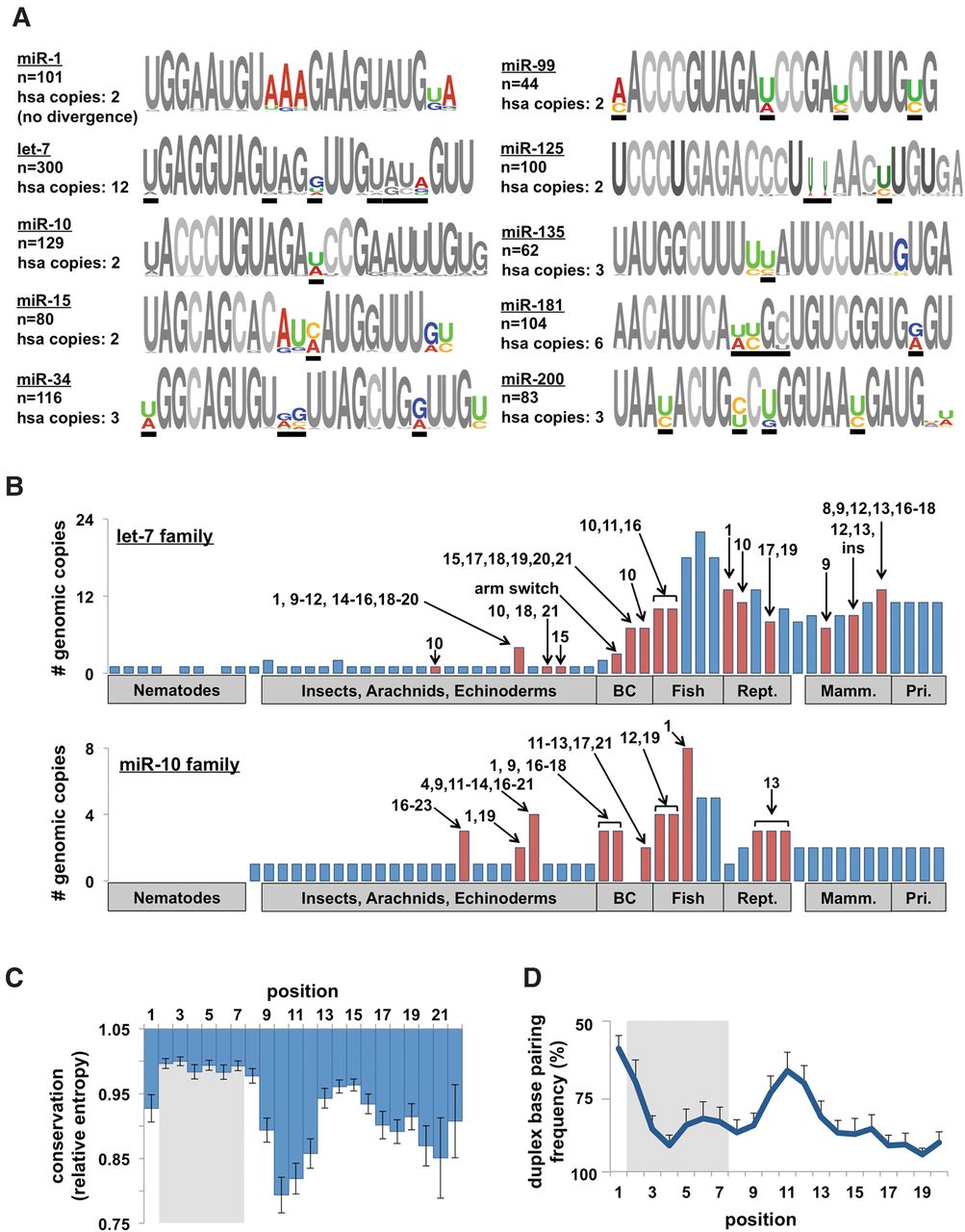Evolutionary patterns of highly conserved miRNA families. (A) Sequence logos for 10 representative miRNA families from all metazoan species. Colored nucleotides represent highly variable positions across species (hotspots). Number of miRNAs in each family and the number of copies in the human genome are noted. Black bars represent the positions that are variable within the human families. (B) The number of family members of let-7 and miR-10b in metazoan species. Arrows and numbers specify the position(s) of nucleotide changes within the mature miRNA relative to the nearest species. The numbers represent changes unique to that species, not cumulative changes. Red bars denote species with sequence changes. (C) We calculated the conservation score (entropy) of each position in all 62 families and combined them to reveal general trends in sequence evolution. Conservation score normalized to most conserved position (p3). (D) Frequency of base-pairing between miRNA/miRNA* strands in the miRNA duplex. Base-pairing information was extracted from alignments on miRBase. This figure is representative of 62 families in eight species.