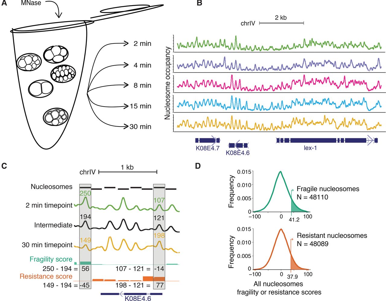 An MNase digestion time-course on C. elegans embryos. (A) Mixed-stage embryos were collected from gravid hermaphrodites by bleach treatment. Dissociated nuclei from mixed-stage embryos were incubated with MNase for 2, 4, 8, 15, or 30 min. (B) Paired-end reads from each timepoint were mapped to the C. elegans genome, normalized, and Gaussian smoothed for display. High signals represent regions of the genome protected from MNase digestion. Region plotted: Chr IV position 12,074,951–12,084,347. (C) Calculation of fragility and resistance scores. (Fragility) For each nucleosome, the average occupancy of the intermediate timepoints is subtracted from the 2-min timepoint. (Resistance) For each nucleosome, the average occupancy of the intermediate timepoints is subtracted from the 30-min timepoint. Intermediate timepoints are 4, 8, and 15 min. Region plotted is Chr IV position 12,076,980–12,078,364. (D) Distribution of fragility and resistance scores at all nucleosomes. The top 10% of each class (shaded in green and orange, respectively) were considered “fragile” or “resistant.”