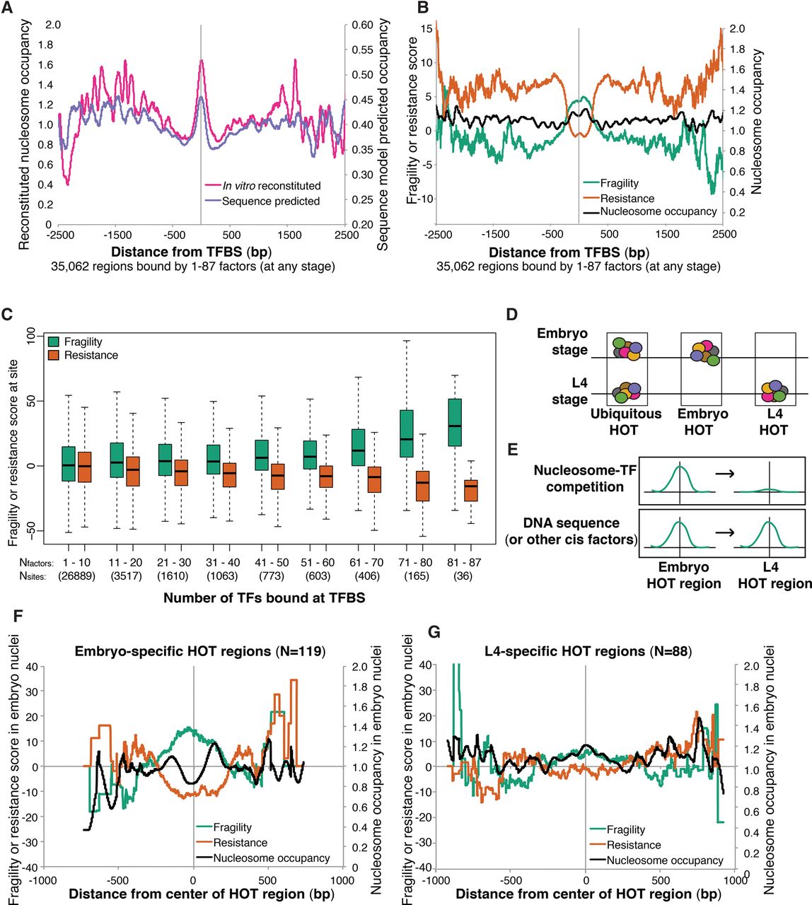 Competition with transcription factors influences nucleosome fragility. (A) Average reconstituted nucleosome occupancy (Locke et al. 2013) and computational nucleosome occupancy model scores (Kaplan et al. 2009) at 35,062 regions bound at any stage by any number of transcription factors. (B) Average fragility, resistance, and intermediate nucleosome occupancy scores are plotted around the same set of intervals from A. (C) Boxplot of average fragility or resistance scores at groups of sites bound by different numbers of transcription factors. Nfactors = number of transcription factors bound. Nsites = number of regions in each category. (D) Cartoon characterization of how embryo-specific and L4-specific HOT regions were identified. (E) Model to distinguish whether trans (top) or cis (bottom) effects result in nucleosome fragility at a given nucleosome in the embryo. Hypothetical fragility scores are represented. (F) Fragility, resistance, and nucleosome occupancy scores measured in the embryo at 119 embryo-specific HOT regions. (G) Fragility, resistance, and intermediate nucleosome occupancy scores at 88 L4-specific HOT regions.