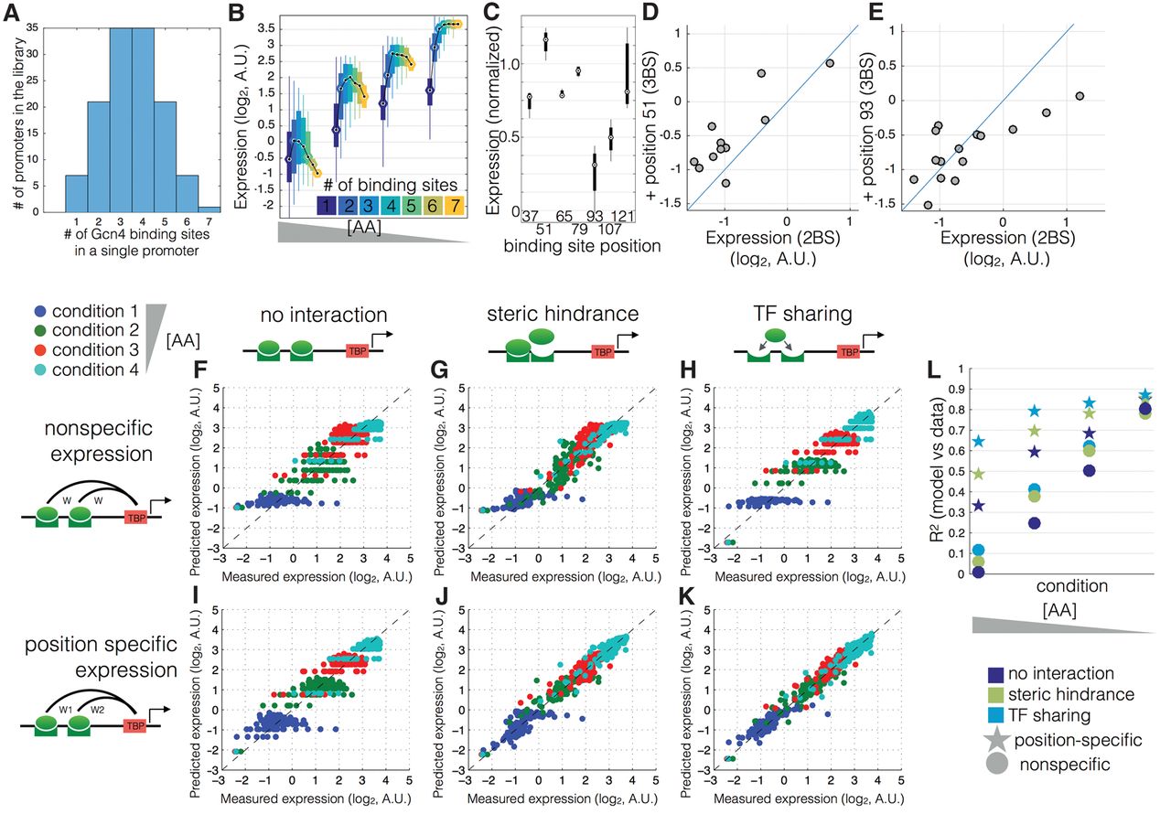 A model that incorporates TF sharing with specific position-expression can best explain expression across all amino acid concentrations. (A) The library consists of promoters with identical Gcn4 binding sites placed at one of seven locations in the promoter. (B) Shown are the measured expression levels (y-axis) as a function of binding site number (different colors) at four AA concentrations (different groups along the x-axis) for Gcn4. Each box contains data for all promoters with that number of binding sites and no other features (e.g., no nucleosome disfavoring sequences or binding sites for other TFs). The black line shows the median expression level for all promoters with that number of binding sites. (C) Shown is the expression for each promoter with a single Gcn4 binding site, normalized so that all conditions have the same mean expression. (D,E) Shown is the effect of adding a third binding site (at position 51 or position 93) to a promoter that already has two binding sites. The expression of the two binding site promoters (x-axis) is graphed against the three binding site promoters (y-axis). (F–L) Each point shows a single promoter measured at one of four conditions (blue, green, red, cyan in decreasing [AA] order) (x-axis) and the predicted expression levels (y-axis) of that promoter, for the six different models, fitted in cross-validation to the data shown in A, which are promoters with one to seven high-affinity Gcn4 binding sites (ATGACTCAT). R2 values were computed for absolute predicted expression on the test data. Each model includes either position-specific expression (a unique weight is associated with each unique binding site position) or nonspecific expression (all binding site positions share the same weight), and either no interaction, steric hindrance (a negative weight for multiple bound configurations), or TF sharing (the [TF] weight is divided by the number of sites). We note that the discretization of the y-axis in F–I is due to the fact that, in the absence of interactions and position-specific expression, all binding sites drive equal expression.