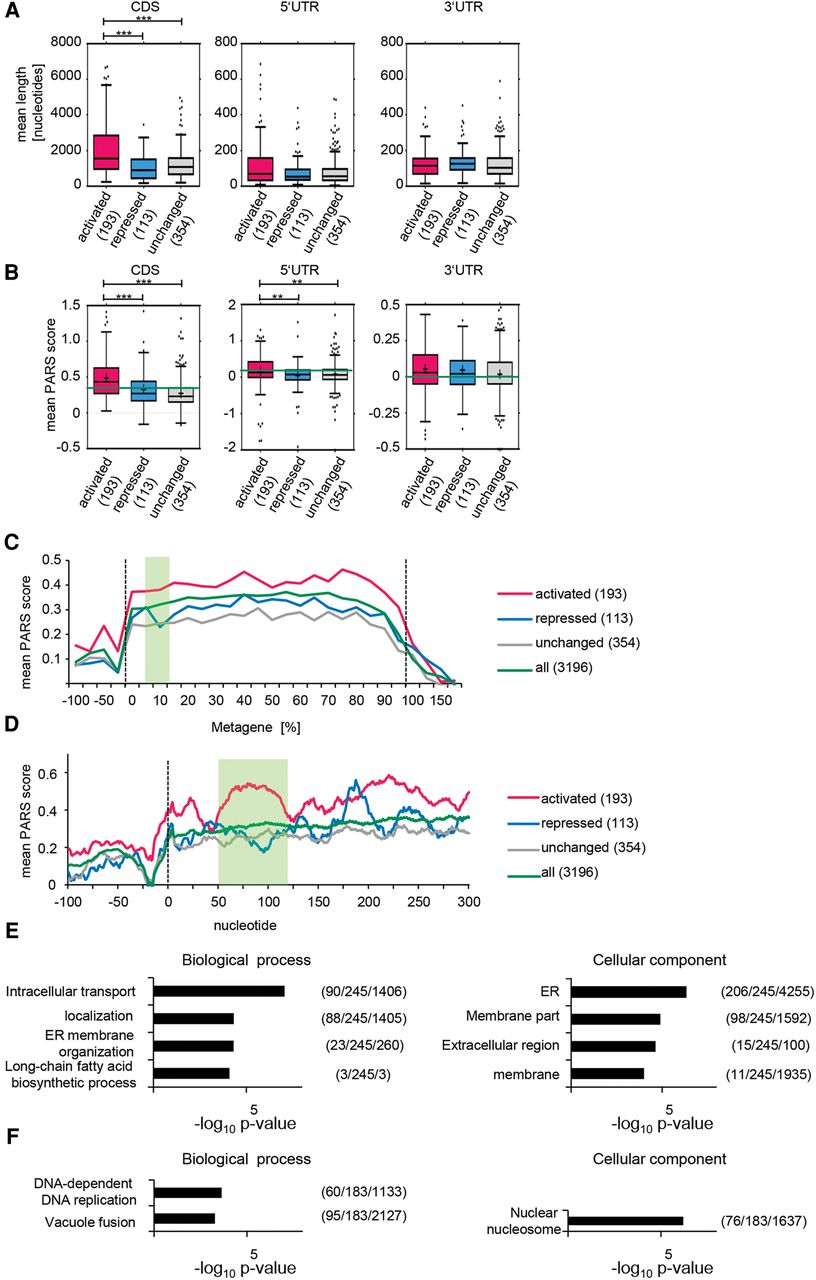 Cellular mRNAs translationally activated by Dhh1 contain highly structured CDSs. From the total number of mRNAs translationally activated, translationally repressed, and unchanged, only the given numbers were analyzed; as for the rest, the UTRs and CDSs are not annotated. (A) Genes translationally activated by Dhh1 have a significantly longer CDS (P < 0.0001 [***]). P-values were computed after permuting randomly 1000 times the labels of the genes in the two groups (detailed in Supplemental Methods). Distribution of the average length of the 5′ UTR, CDS, and 3′ UTR for genes translationally activated, repressed, and not affected by Dhh1 represented in a Tukey plot. Numbers in parentheses give the number of transcripts per subset. (B) Genes translationally activated by Dhh1 have significantly higher PARS scores in the CDS (P < 0.0001 [***]) and the 5′ UTR (P < 0.01 [**]). P-values as in A. Distribution of the average PARS score of the 5′ UTR, CDS, and 3′ UTR for genes translationally activated, repressed, and not affected by Dhh1 represented in a Tukey plot (band inside each box represents the median); cross indicates mean PARS score of each subset; green line marks mean PARS of all genes. Numbers in parentheses give the number of transcripts per subset. (C) Metagene PARS score analysis of the different sets of genes. Y-axis shows the average of smoothened PARS scores on the corresponding region. Smoothing is achieved by calculating the average PARS scores over a window of size 20 centered on the corresponding nucleotide. Dotted lines mark the start and stop codon; green box marks the 7.5%–15% region, one area with an especially high difference between the PARS scores. Numbers in the legend indicate the number of analyzed genes in each subset. (D) As in C, but for the 5′ UTR and the first 300 nt. Green box marks nucleotides 50–120. (E) GO term analysis for genes translationally activated and bound by Dhh1 regarding biological process and cellular component. Numbers in parentheses indicate (B/n/b). B = total number of genes associated with functional category (often comprising several GO terms grouped by REVIGO); n = number of genes in input list; b = number of genes in intersection. (F) As in E, but for genes translationally repressed and bound by Dhh1.