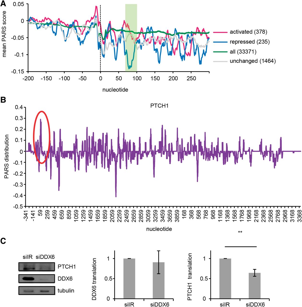 Dhh1-mediated translational control is seemingly conserved from yeast to humans. (A) PARS score distribution analysis of the human mRNA counterparts for the 5′ UTRs and the first 300 nt of the CDS. Axis and smoothing as in Figure 5C. Green box marks nucleotides 60–100. (B) PARS score of the 5′ UTR and the first 300 nt of PTCH1 mRNA. (C) DDX6 drives translation of PTCH1. Western blot, qPCR, and translation rates of PTCH1 after DDX6 silencing. Translation was determined by correcting protein levels by the amount of the corresponding RNA. As a control for equal sample size, tubulin protein levels and HPRT1 mRNA levels were examined. Experiments have been carried out at least three times independently. (**) P < 0.05, t-test.