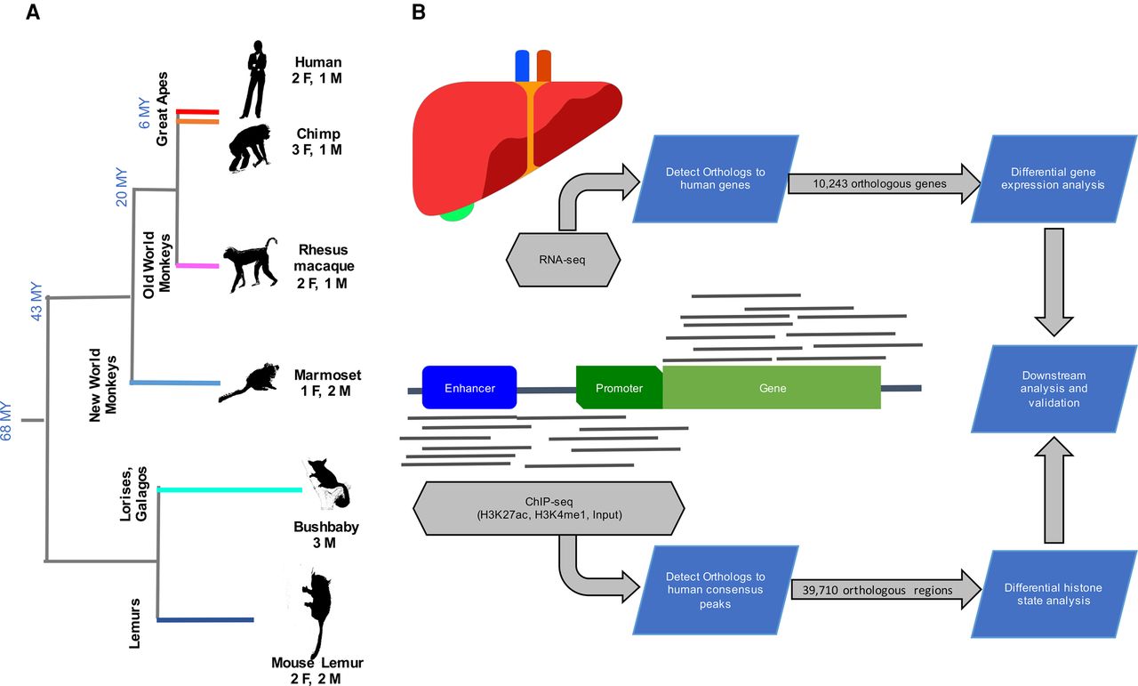 Experimental design and analytical pipeline. (A) Sampling included three to four specimens from six species representing all major primate clades. (B) ChIP-seq and RNA-seq profiles were produced from the liver samples. Differential histone modification and gene expression analyses were performed on the orthologous CREs and genes in each species, respectively.
