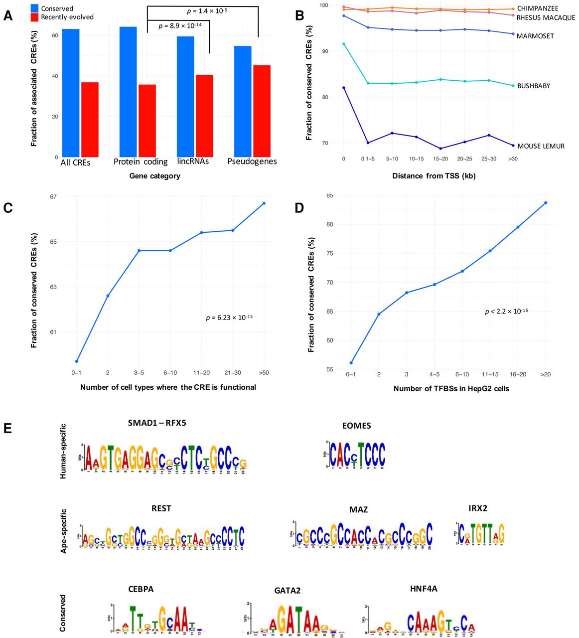Genomic features associated with CRE conservation. (A) Fraction of conserved and recently evolved CREs associated with protein-coding genes, lincRNAs, and pseudogenes. (B) CRE conservation (y-axis) as a function of distance to the nearest gene start (quantiles on the x-axis). (C) CRE conservation (y-axis) as a function of cell-type specificity (quantiles on the x-axis) based on ENCODE data. (D) CRE conservation (y-axis) and number of ENCODE HepG2 TFBSs overlapping each CRE (quantiles on the x-axis). (E) Examples of enriched motifs in human-specific CREs, ape-specific CREs, and conserved CREs.