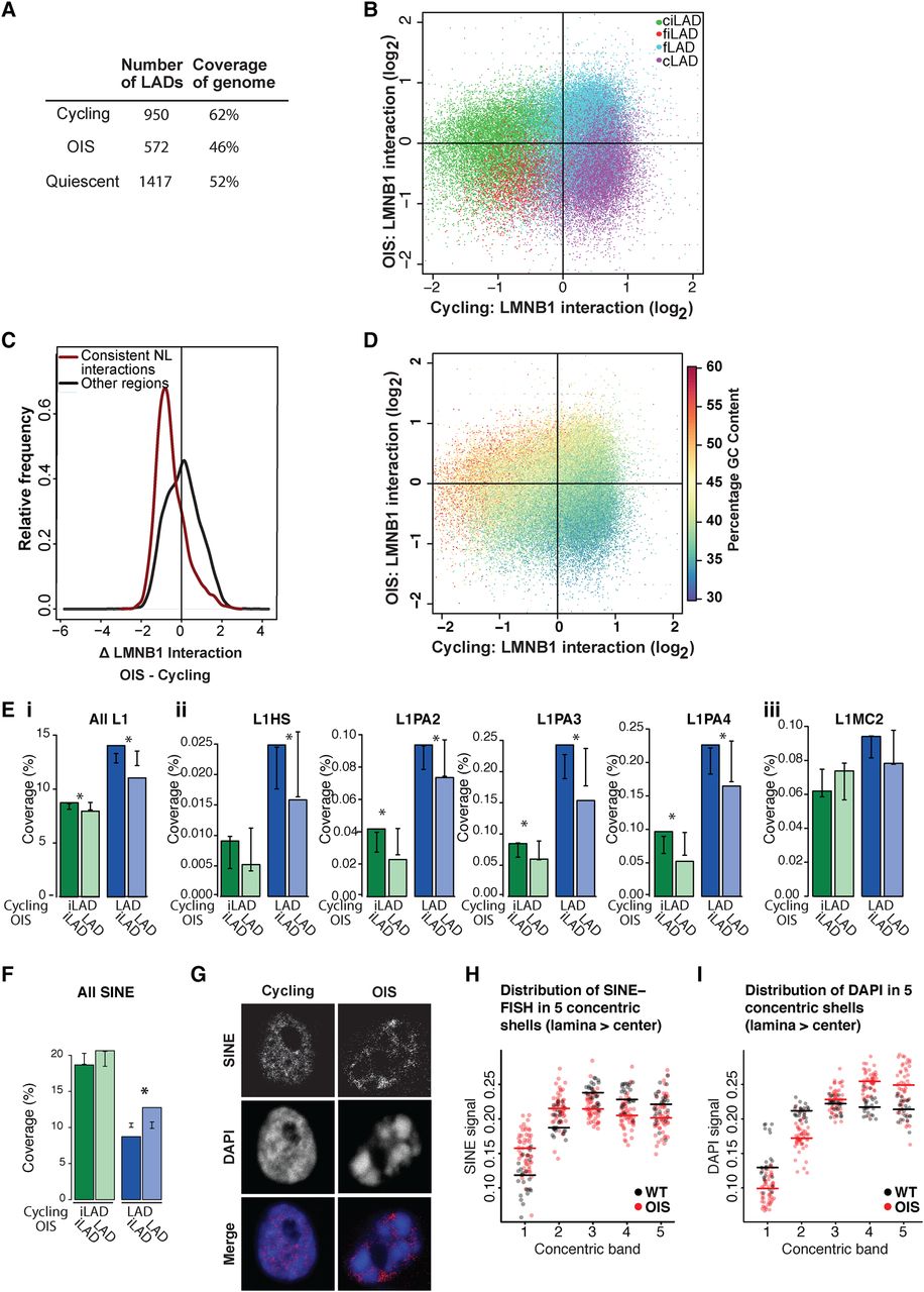 Loss of NL interactions during OIS affects primarily constitutive LADs. (A) LAD statistics in cycling, OIS cells, and quiescent cells. (B) Scatter plot representing the ratio of Dam-lamin B1 interaction within 50-kb windows for cycling (x-axis) and OIS cells (y-axis). The circles are colored according to their cLAD/ciLAD/fLAD/fiLAD status. cLADs (purple) show decreased NL binding in OIS cells. (C) Density plot of the change in LMNB1 interaction for consistent NL interactions compared to regions without consistent interactions. (D) Scatter plot showing LMNB1 binding ratio in cycling (x-axis) versus LMNB1 binding ratio in OIS cells (y-axis) in 50-kb windows. The circles are colored according to the percentage of GC content. (E,F) Repeat element coverage in LADs or iLADs in cycling cells after OIS: (green) repeat element coverage of iLADs in cycling cells that are still in iLADs in OIS cells (dark green) or moved to the NL in OIS cells (light green); (blue) repeat element coverage of LADs in cycling cells that detach from the NL in OIS cells (dark blue) or are still at the NL in OIS cells (light blue). (E) LINE-1 element coverage in LADs and iLADs: (i) all L1 elements; (ii) human- and primate-specific L1 repeats; (iii) L1MC2, a mammalian L1 repeat. Error bars indicate two standard deviations around mean L1 density for OIS LADs and iLADs randomly assigned to LAD or iLAD in OIS cells by circular permutations. Differences in iLAD and LAD L1 element density in OIS cells that was significantly different ([*] P < 0.05) to the expected density generated from random assignment of the LADs and iLADs in cycling cells. (F) SINE element coverage in LADs and iLADs. (G) Single z-section example of confocal images of cycling and OIS cells stained with a SINE probe (Alexa Fluor-555, grayscale). DNA was stained with DAPI. (H,I) Quantification of SINE (H) and DAPI (I) signal intensities in confocal sections, in five concentric shells having equal surface areas (shell 1 is closest to the NL, shell 5 is at the nuclear center). Each dot represents one nucleus; horizontal lines depict medians.