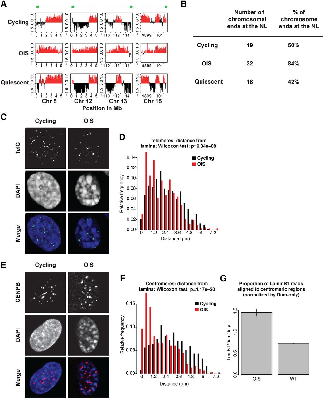 Telomeric and centromeric regions shift toward the NL in OIS cells. (A) Increased nuclear lamina association of chromosomal ends in OIS cells compared to cycling and quiescent cells in the 2-Mb region closest to the end of the chromosome. The y-axis shows log2 Lamin B1 binding ratio for each graph. (B) Quantification of the frequency of interaction of chromosomal extremities as defined in A in cycling, OIS, and quiescent cells. Only the 38 chromosome ends for which a sequence assembly is available were analyzed. (C) Single z-section example of confocal images of cycling and OIS cells stained by FISH with a telomere probe (FITC, grayscale). DNA was stained with DAPI. (D) Distribution of distances of telomere signals to the NL in cycling and OIS cells. Data are from two independent experiments. Number of nuclei counted: 59 (OIS), 61 (cycling); total number of telomere signals counted: 417 (OIS), 740 (cycling). The difference in the distribution of the telomere distance between cycling and OIS cells was statistically significant (P-value = 2.34 × 10−8, Wilcoxon test). (E) Centromeres labeled with a CENP-B antibody (Alexa Fluor-568, grayscale). Single z-section examples of confocal images are shown. DNA was stained with DAPI. (F) Distribution of centromeres determined as in D. Number of nuclei counted: 55 (OIS), 49 (cycling); total number of centromere signals counted: 299 (OIS), 373 (cycling). The distributions differ statistically significantly (P-value = 4.17 × 10−20, Wilcoxon test). (G) Average DamID signals in centromere-proximal regions are stronger in OIS cells compared to cycling cells (P = 0.0067, Welch two-sample t-test; data based on two independent DamID experiments).