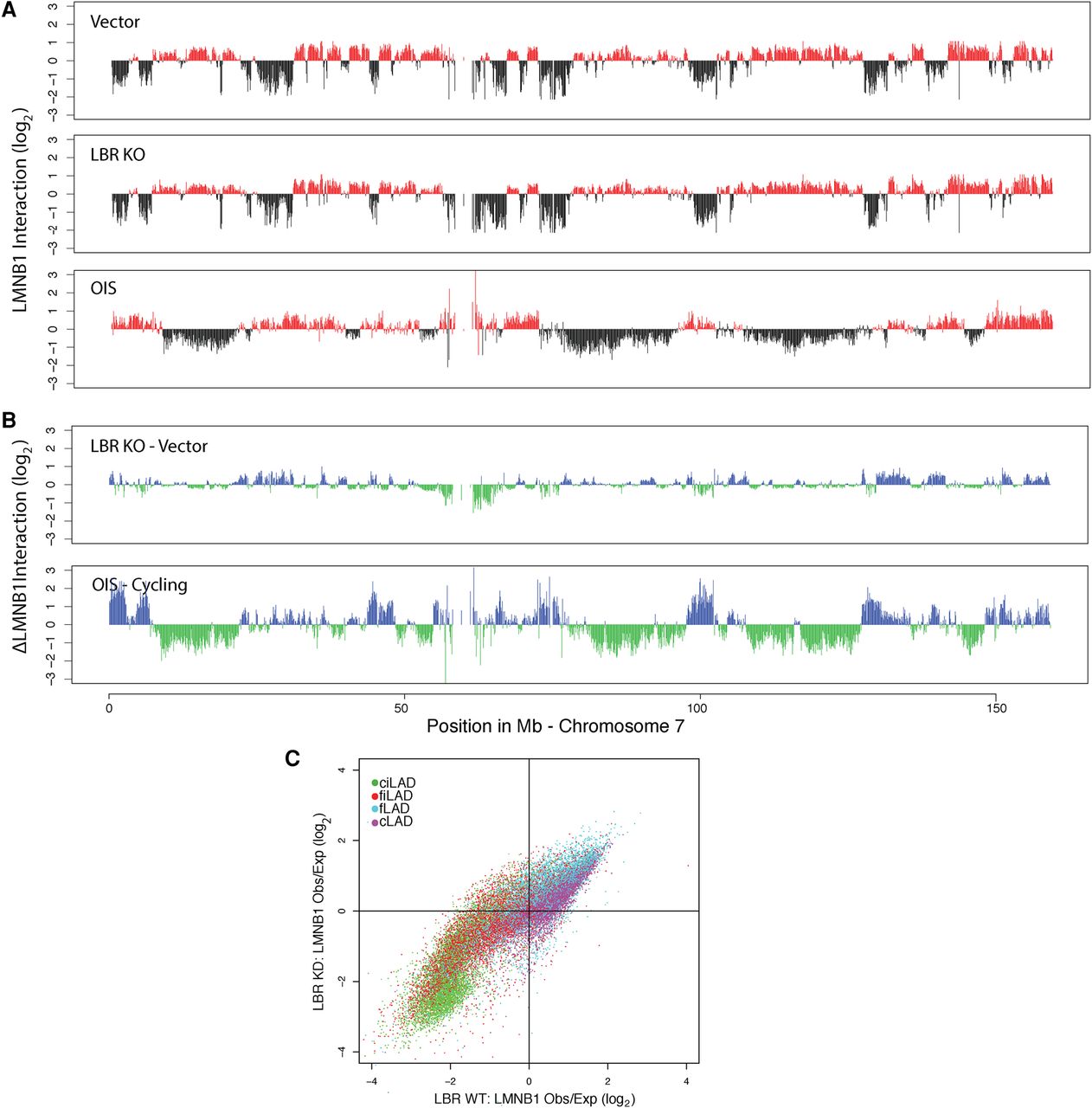 Deletion of LBR does not cause OIS-like changes in NL interactions in cycling human HAP1 cells. (A) LMNB1 DamID profiles along Chromosome 7 for wild-type and LBR KO cycling human HAP1 cells. (B) Changes in LMNB1 interaction after LBR KO (top). For comparison, the changes in NL interactions upon OIS (as in Fig. 1C) are shown (bottom). (C) Scatter plot of the ratio of Dam-LMNB1 interaction within 100 kb windows for wild-type (x-axis) and LBR KO cells (y-axis). The circles are colored according to their cLAD/ciLAD/fLAD/fiLAD status.