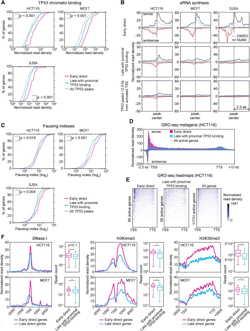 Early and late TP53 target genes display distinct regulatory features. (A) Cumulative distribution plots of TP53 ChIP-seq peak read densities for TP53 binding events within 25 kb of the transcription start site of early direct targets (magenta), late targets with proximal binding (turquoise), and all TP53 peaks across the genome (gray). Statistics: Mann-Whitney U test. (B) Metaprofiles of GRO-seq signals within 2.5 kb from the TP53 ChIP-seq peaks associated with genes in the indicated categories. Normalized read density represents GRO-seq reads per bp per 10 million mapped reads. (C) Cumulative distribution plots of RNA polymerase pausing indexes for transcriptionally active genes in the indicated categories in HCT116 cells. Statistics: Mann-Whitney U test. (D) Metagene profiles showing GRO-seq signal distribution at direct early versus late targets with proximal binding, in comparison to all transcriptionally active genes in vehicle (DMSO)-treated HCT116 cells. Normalized read density represents GRO-seq reads per bp per 10 million mapped reads, adjusted for gene length. (E) Heat maps displaying GRO-seq signals (sense strand only) at active early direct targets, late targets with proximal binding, and all active genes in vehicle-treated HCT116 cells. Normalized read density represents GRO-seq reads per bp per 10 million mapped reads, adjusted for gene length. (F) Metagene profiles and box and whisker plots of DNase I sensitivity, H3K4 trimethylation, and H3K36 trimethylation at early direct targets and late targets with proximal TP53 binding. Data obtained from the ENCODE project. Statistics: Mann-Whitney U test, P < 0.01. See also Supplemental Figure S4.