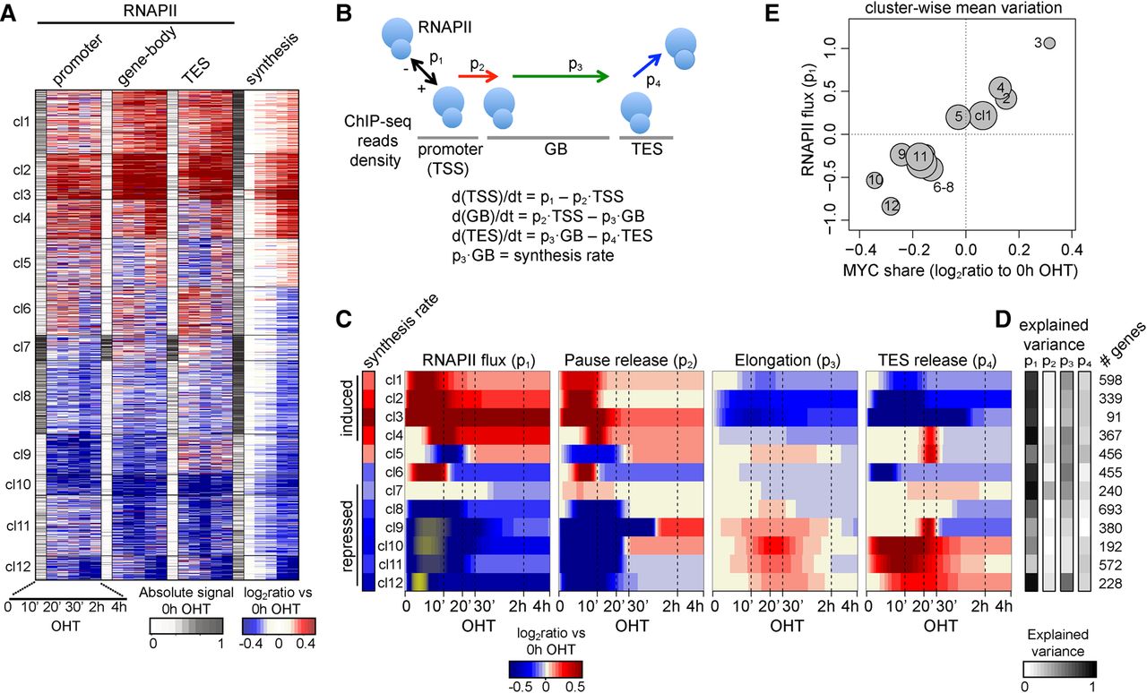 Dynamics of RNAPII loading and progression along transcriptional units. (A) Clusters grouping genes with similar modulation of RNAPII density (change in ChIP-seq reads within various portions of the transcriptional units) and synthesis rate; for each data type, the first column (white to gray) indicates the normalized intensity of the feature in the untreated condition, while the other columns indicate the up- (red) or down- (blue) modulation as the log2 ratio to the untreated condition. (B) The model used to describe progression of RNAPII through the transcriptional units. p1 is the flux of polymerase into the promoter region, p2 is the rate of release from promoter, p3 the elongation rate, and p4 the rate of release from the TES. Model parameters were inferred from the variation of RNAPII density over time within the promoter, gene-body, and TES, respectively. The net amount of RNAPII within each region of a gene was assumed to result from its entry from the preceding compartment and its exit to the next one—the compartment before the promoter and after the TES being the nucleoplasm. (C) Heat map of the changes in p1–4 for each cluster (rows), determined as the log2 ratio to the untreated condition (red for increase, and blue for decrease). Yellow for p1 marks negative parameter values, i.e., loss of RNAPII from the promoters. (D) For each cluster, the explained variance of a model where only that parameter can vary over time is displayed, indicating the ability to recapitulate the changes in RNAPII binding and synthesis rate; the number of genes is indicated on the right. (E) Variation of MYC share at promoters (x-axis, determined for each cluster as the average change at 10 min–4 h OHT compared to the untreated condition) versus the variation of the RNAPII flux (y-axis, at 4 h OHT); the size of the circle is proportional to the number of genes within the cluster.