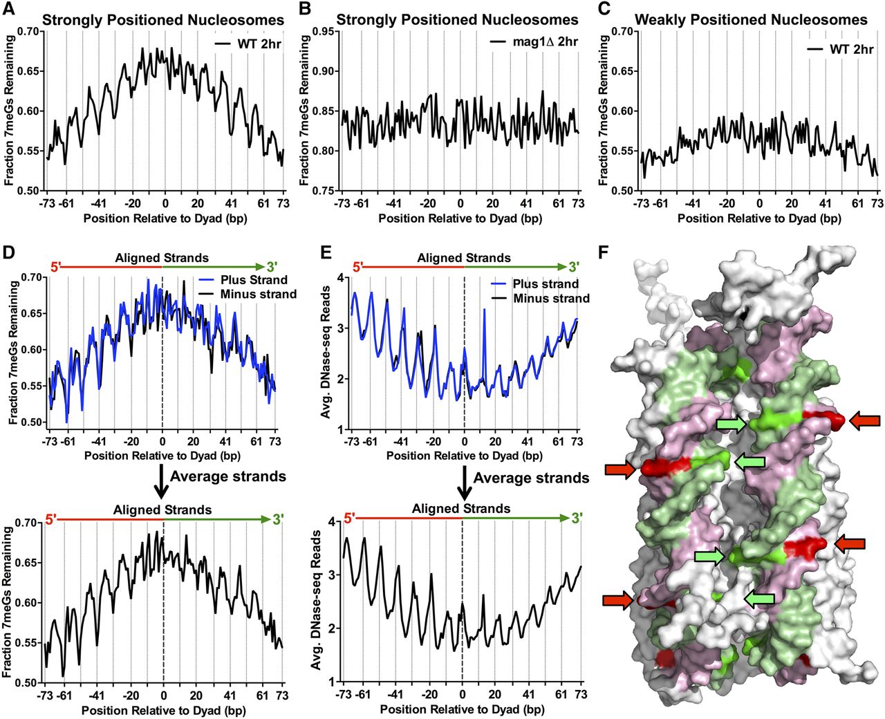 Repair of 7meG lesions is regulated by their rotational and translational setting within strongly positioned nucleosomes. (A) Fraction of 7meG lesions remaining following 2-h repair in WT relative to 0-h mag1Δ control among ∼10,000 strongly positioned nucleosomes (nucleosome score > 5) across the yeast genome is plotted relative to the distance from the central dyad axis of the nucleosome (“dyad”). Nucleosomes overlapping with the MAG1 gene, which is deleted in the mag1Δ control strain, were excluded from this analysis. Vertical dotted lines indicate “Out” rotational settings. (B) Translational and rotational setting among strongly positioned nucleosomes does not affect the fraction of 7meG lesions remaining following 2-h repair in a mag1Δ mutant relative to a 0-h control. (C) Same as in part A, except the fraction of 7meG lesions remaining is plotted among ∼7500 weakly positioned nucleosomes (nucleosome score < 1). (D) Effect of rotational setting on 7meG repair occurs primarily 5′ of the nucleosome dyad. Data are plotted similarly to part A, except the plus and minus strands are shown individually and aligned in a 5′ to 3′ orientation. Bottom panel: weighted strand average of fraction of 7meG lesions remaining for the aligned plus and minus strands. (E) The effect of rotational setting on DNase-seq read density, a measure of chromatin accessibility, also is more prominent 5′ of the nucleosome dyad. Bottom panel: average DNA-seq reads for the aligned plus and minus strands. (F) At “Out” rotational settings (indicated with arrows), the 5′ half of the nucleosomal DNA (pink/red) faces the solvent, while the 3′ half of the nucleosomal DNA (green) faces the other DNA gyre. Image was created using PyMOL (http://www.pymol.org/) to visualize PDB ID 1kx5.