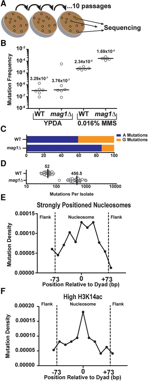 Analysis of MMS-induced mutations across the genome of WT and mag1Δ yeast. (A) Individual isolates (n = 24) of WT and mag1Δ yeast strains were grown on 0.016% MMS-supplemented yeast extract peptone dextrose adenine (YPDA) media at 30°C for 48 h. Separate lines were then streaked for singles (not explicitly shown) on additional MMS plates, for a total of 10 passages. At the end of the passaging, unique isolates were picked for whole-genome sequencing. (B) CanR frequencies were measured for six independent isolates of WT and mag1Δ strains of yeast (open circles), which were either untreated (grown on YPDA media) or treated for 2 d with 0.016% MMS. Black horizontal bars and numbers indicate the median frequency of CanR for each genotype and treatment. Data were analyzed using a two-tailed Mann-Whitney U test. (C) Percentage of A- and G-mutations in whole-genome sequencing of MMS-treated mag1Δ and WT strains. (D) Number of mutations per isolate from whole-genome sequencing of MMS-treated WT and mag1Δ strains. (E) Strongly positioned nucleosomes have elevated mutation density relative to flanking DNA regions in WT yeast. Mutations from MMS-treated WT isolates were mapped to strongly positioned nucleosomes (score > 5) and normalized by sequence context. An area of ∼180 bp was examined, which consisted of the main nucleosome (147 bp) and an additional flank on either side (∼30 bp total). Each DNA sequence was then divided into 11 bins, each of ∼16 bp. Comparisons of the number of mutations observed between nucleosome-bound and flanking DNA was performed using χ2 analysis. (F) Same as in part E, except mutation density in WT yeast was analyzed for 10,000 nucleosomes with the highest levels of H3K14 acetylation (H3K14ac) (Weiner et al. 2015).