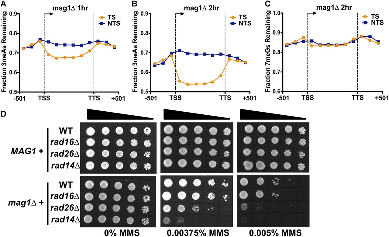 Transcription-coupled repair of 3meA lesions in a BER-deficient (mag1Δ) strain. (A,B) Fraction of 3meA lesions remaining in a mag1Δ 1- and 2-h sample relative to mag1Δ 0-h control was plotted for bins spanning 501 bp upstream of the transcription start site (TSS), the transcribed region of the gene, and 501 bp downstream from the transcription termination site (TTS) for 5762 yeast genes. (C) No transcription-coupled repair of 7meG lesions in a mag1Δ strain. Same as in part A, except the fraction of 7meG lesions remaining following 2-h repair in a mag1Δ strain was plotted. (D) MMS sensitivity of yeast strains containing single or double mutants in MAG1 or the indicated NER genes (i.e., RAD16, RAD26, and RAD14) when spotted on plates containing the indicated concentrations of MMS.