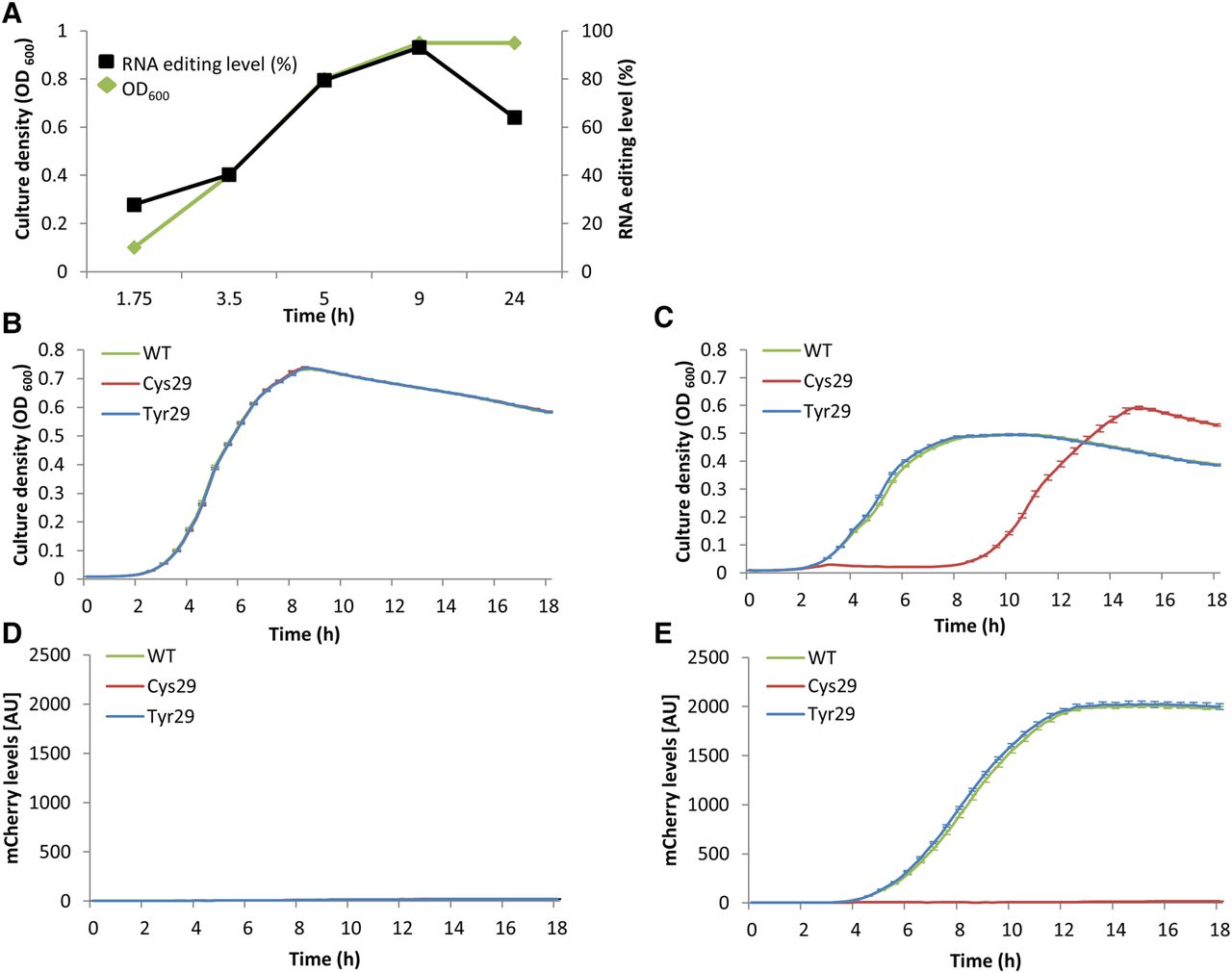 hokB mRNA editing increases with cell density and enhances its toxicity. (A) hokB mRNA editing levels (black) in E. coli MG1655-EcM2.1 WT strain as measured in different culture densities (green). Notably, the standard error of measuring editing levels in a given coverage in all samples was smaller than 0.00012%. (B–E) The E. coli Top10-ΔhokB strain was transformed with inducible plasmids harboring the WT (green), constitutively edited (Cys29, red), and noneditable (Tyr29, blue) hokB versions fused to mCherry reporter protein (N-terminus). (B) Growth analysis without induction of hokB (0% arabinose). (C) Growth analysis with induction of hokB (0.2% arabinose). (D) mCherry levels without induction (0% arabinose). (E) mCherry levels with induction (0.2% arabinose). Error bars represent standard error for 14 replicates (B–E).