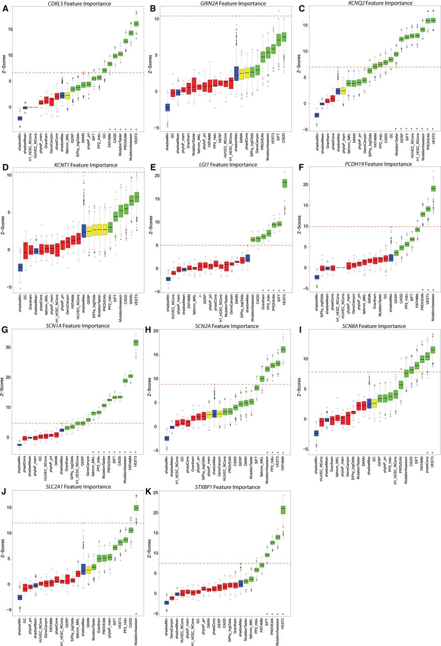 Boruta feature evaluations: (A) CDKL5; (B) GRIN2A; (C) KCNQ2; (D) KCNT1; (E) LGI1; (F) PCHD19; (G) SCN1A; (H) SCN2A; (I) SCN8A; (J) SLC2A1; and (K) STXBP1. Blue box plots correspond to minimal, average, and maximum Z-score of a shadow feature. Red, yellow, and green box plots represent Z-scores of uninformative, inconclusive, and informative features, respectively. (*) Indicates the “highly informative” features for which the minimum nonoutlier random forest Z-score exceeded the maximum random forest Z-score of the best performing randomized shadow feature (red dashed line).