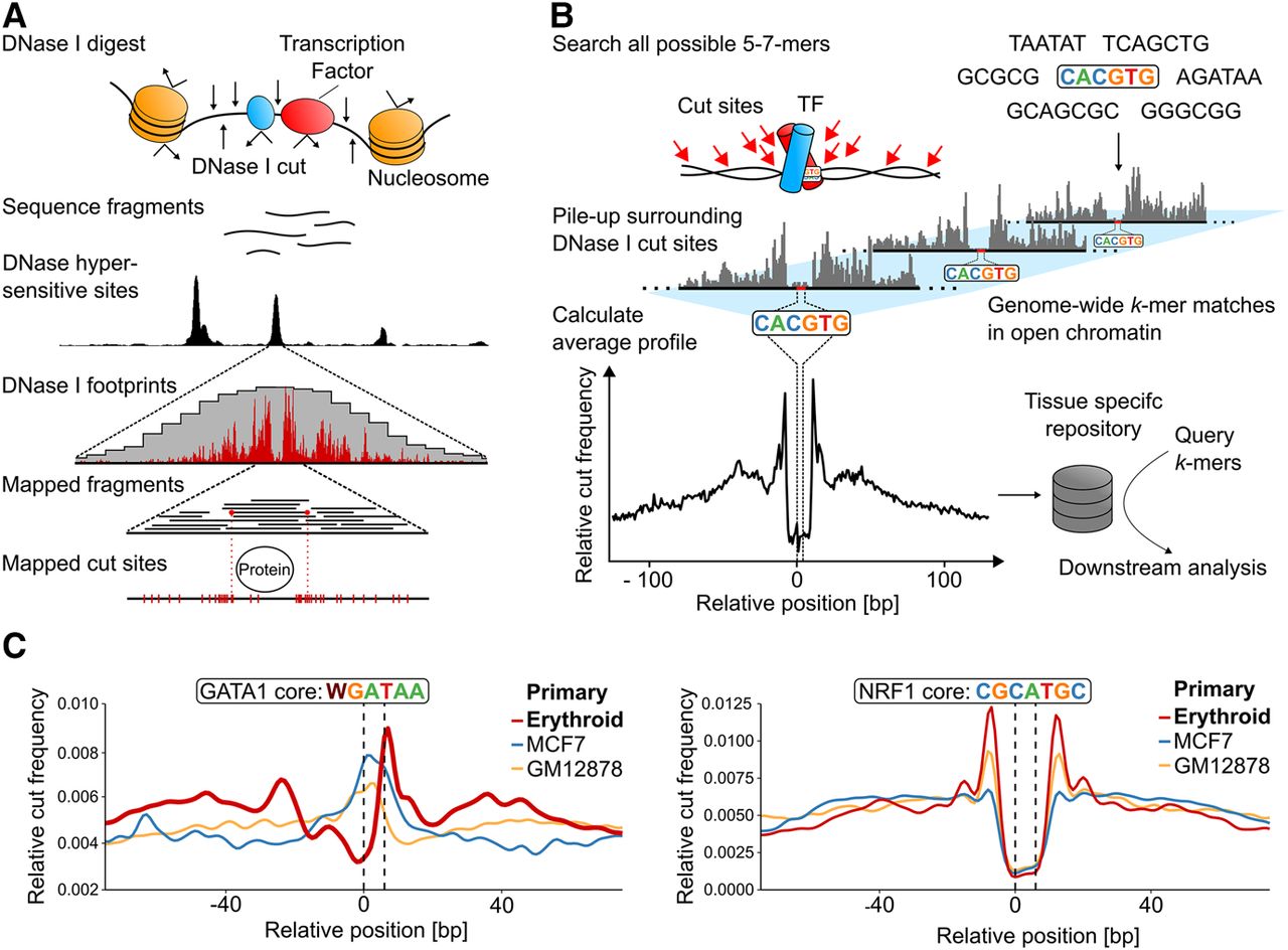 Generation of k-mer-based, genome-wide average footprints. (A) The principle of generating the digital DNase I footprints occurring in a single genomic location. Exposure of nuclei to DNase I causes frequent double cuts in open chromatin regions, releasing small fragments that can be identified by sequencing. Deep sequencing allows for high-density mapping of the ends of these fragments, which represents the DNase I digestion points and reveals positions protected by TF binding. (B) Sasquatch overview. Genome-wide cut frequency profiles are piled up over all occurrences of all possible short sequences (k-mers) within DNase I hypersensitive sites. For k-mers associated with TF binding, the resulting average cut frequency profiles display average footprints characterized by a cut-depleted center flanked by shoulders of enriched cut frequency. (C) Average profiles reflect tissue specificity of TF footprints as demonstrated by an erythroid-specific TF GATA1 and by a ubiquitous TF NRF1. Average cut profiles were calculated from DNase-seq of primary erythroid, breast cancer (MCF-7), and B-lymphocyte cells (GM12878). The highlighted dotted black lines indicate the location of the motif within the footprint.