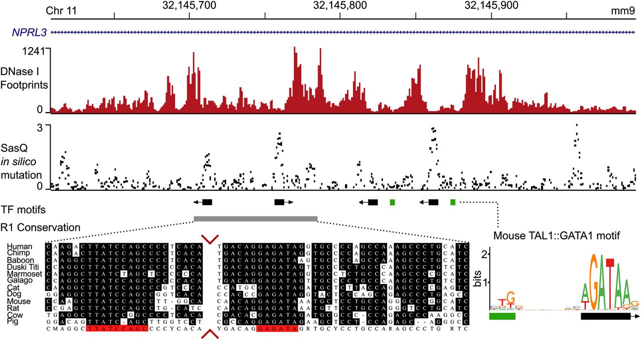 Overlay of DNase I footprints, Sasquatch in silico mutation predictions, and sequence conservation. The top panel shows deep DNase I footprints in mouse primary erythroid cells over the mouse alpha-globin locus R1 enhancer, which is present within an intron of NPRL3. Sasquatch's in silico mutation analysis using the same DNase-seq data reveals clusters of predicted high-damaging variants overlapping the footprints and known GATA1 binding motifs (middle panel). While sequence conservation analysis can identify the two leftmost binding sites, the in silico mutation analysis can also identify the murine-specific binding sites. Sequence conservation analysis adapted from Hughes et al. (2005). The conservation panel was trimmed to visualize both conserved sites (red arrows).