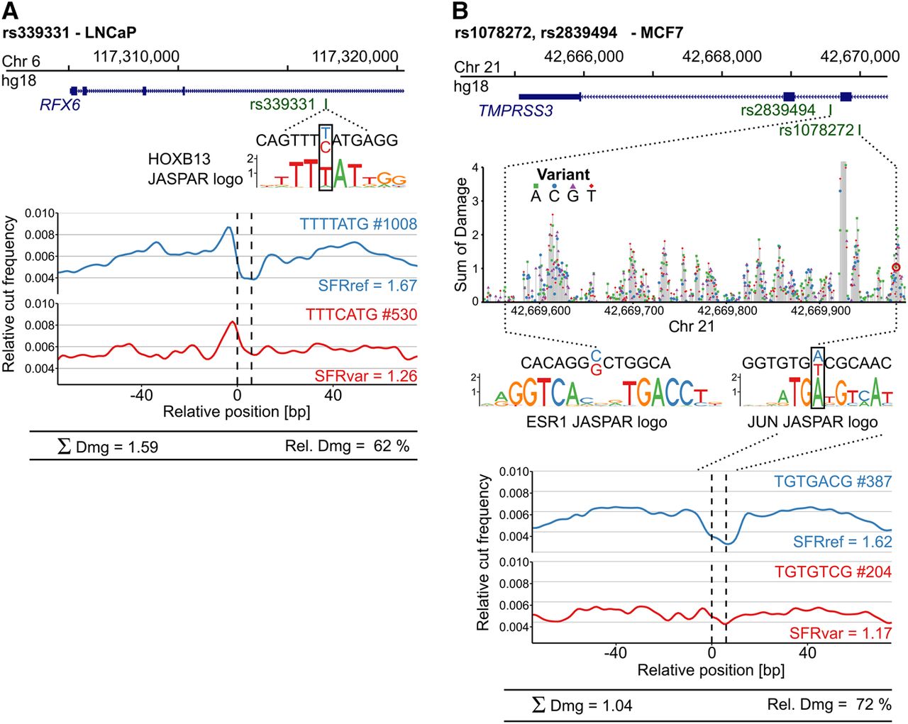 Assessing the footprint-damaging potential of functionally validated SNPs in nonerythroid tissues. Sasquatch-predicted damaging potential recapitulates functionally validated SNPs identified from GWAS studies in prostate and breast cancer. (A) SNP rs339331 T>C has been identified as significantly associated with prostate cancer risk and functionally validated to impair RFX6 expression by disrupting a HOXB13 binding site (Huang et al. 2014). Comparison of Sasquatch average profiles reflects the binding impairment and predicts a high damaging potential. (B) Two intronic SNPs (rs2839494 and rs1078272) found within an estrogen response element have been identified as significantly associated with survival in breast cancer patients and are functionally validated (Hsiung et al. 2014). Sasquatch predicts rs1078272 A>T to damage a potential JUN binding site, associated with a clear abolishment of a footprint in the average profile. In silico mutation identified rs1078272 to be located within a cluster of damaging variants. In contrast, rs2839494 C>G, proposed to directly alter ESR1 binding, is not detected. This is most likely because Sasquatch is limited in detecting large motifs spanning multiple noninformative bases, due to the use of short k-mers, which is also reflected in the lack of signal in the in silico mutation plot at that region. For the in silico mutation analysis, the T base at SNP rs107827 A>T retrieved from the hg18 reference genome has been changed from the minor to the major SNP allele.