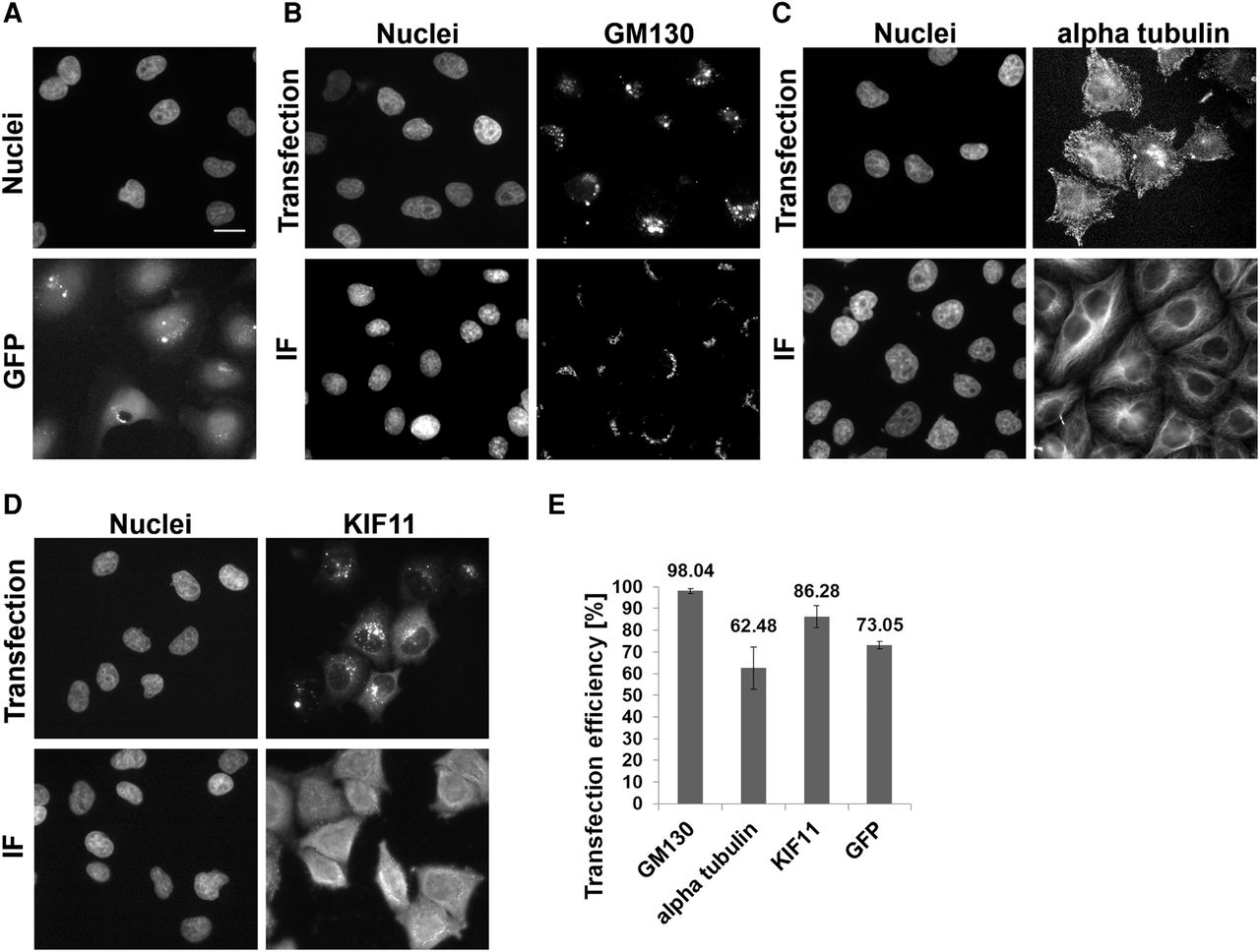 Comparison of protein localization after solid-phase reverse antibody transfection and immunofluorescent staining in HeLa cells. (A) The intracellular distribution of transfected GFP. The upper images show the localization of transfected anti-GM130 (B), anti-alpha tubulin (C), and anti-KIF11 (D) antibodies. The lower images show the results of the IF staining using the same antibodies. (E) Transfection efficiency of antibodies and GFP. Bars represent average transfection efficiency derived from six independent replicas with every antibody shown and 14 independent replicas with GFP; error bars represent the standard deviations. GFP, anti-KIF11, and anti-alpha tubulin antibodies were transfected with Lipofectamine RNAiMAX, using reaction condition I for GFP and condition VIII for antibodies. Anti-GM130 antibody was transfected with Lipofectamine 3000 using condition VI (Supplemental Table S1). The transfections were performed in 384-well plates. Nuclei were counterstained with Hoechst 33342 dye. (Scale bar) 20 µm.