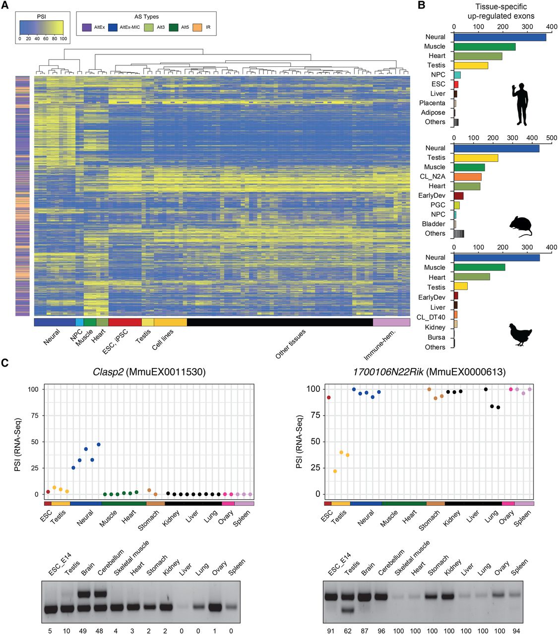Tissue regulation of AS is dominated by neural and muscle. (A) Heatmap and hierarchical clustering of highly regulated AS events (standard deviation of PSIs across samples higher than 20) in widely expressed human genes (events with sufficient read coverage in at least 40 samples). Samples with >80% missing values (i.e., events with read coverage below VLOW) were discarded. Immune-hem: immune-hematopoietic samples. (B) Bar plots showing the number of exons with increased PSI in a specific tissue compared to all other tissue types. (Early Dev) early embryonic stages in mouse (from oocyte to eight-cell stage) and chicken (from Stage X to HH6). (C) RT-PCR validations and corresponding VastDB RNA-seq PSI estimates for exons in Clasp2 (neural, increased PSI) and 1700106N22Rik (testis, decreased PSI).