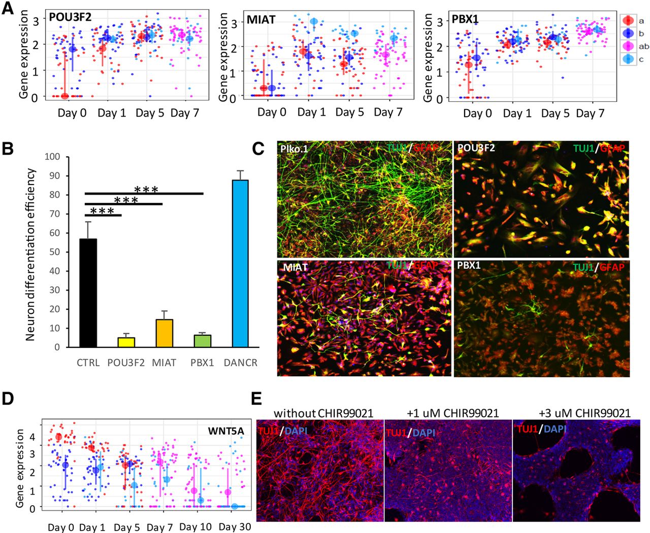 Subpopulation analyses reveal key regulators. (A) Similar to Figure 3B, the expression levels of genes in different cell subpopulations of different time points is shown in dot plots. (B) Knockdown of gene expression experiments was performed for TFs POU3F2, PBX1, and lincRNA MIAT and DANCR during neuronal differentiation (the empty plko.1 vector served as a negative control). (C) Neuron marker TUJ1 (green) and Astrocyte marker GFAP (red) after 7 d of knock down of these candidates. Immunostained images were quantified by Columbus Analysis System to determine the neuron differentiation efficiency. (D) The expression level of WNT5A in different cell subpopulations of different time points is shown in dot plots. (E) NPCs were cultured in neuron differentiation media with different concentrations of WNT signaling activator CHIR99021. Seven days later, immunostaining was performed for neuron marker TUJ1 (red), and nuclei were stained with DAPI (blue). The concentration of CHIR99021 is as shown.
