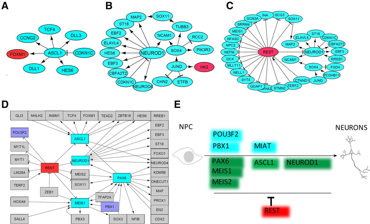 Network analyses of subpopulations reveal underlying mechanism. Gene regulatory networks were assembled based on differential gene expression to define key regulatory pathways that control development of the unique “c” subpopulation. Networks were generated for day 1 (A), day 5 (B), and day 10 (C). The genes labeled in red and green are expressed at low and high levels, respectively, in the “c” cell subpopulation relative to the other cell subpopulation at a given time point. (D) A regulatory network analysis was performed for the 195 TFs that were identified as differentially expressed across all the cell subpopulations and all time points. Purple highlighted genes were chosen for functional validation in Figure 4. (E) A simple model for the dynamic regulators of neuronal development. PAX6, MEIS1, MEIS2, ASCL1, and NEUROD1 are well-known key genes during neurogenesis that were identified by our subpopulation analysis; POU3F2, MIAT, and PBX1 were newly identified by our subpopulation analysis and are critical during neurogenesis. REST, which is identified by our subpopulation analysis, is a well-known repressor during neurogenesis.