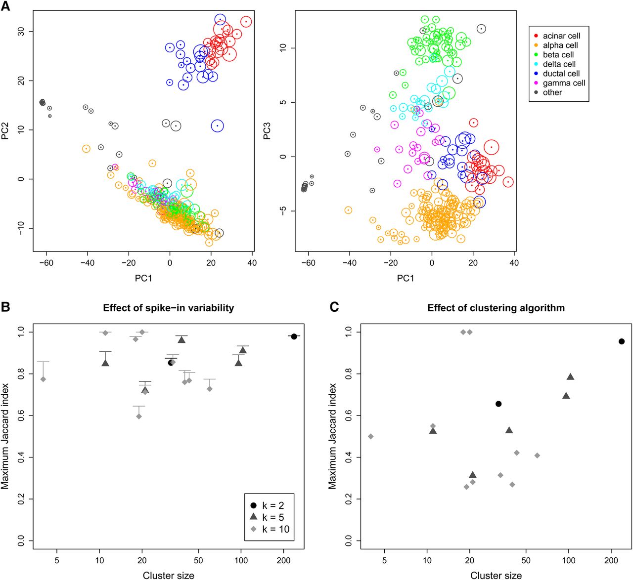 Effect of spike-in variability on dimensionality reduction and clustering in simulated data, based on real scRNA-seq data for cells extracted from a healthy human pancreas (Segerstolpe et al. 2016). (A) PCA plots of the first three principal components, in which each cell is colored according to its annotated cell type from the original study. The circle around each cell contains 95% of remapped locations across the simulation iterations, and represents the deviation in location due to spike-in variability. (B) Clusters were identified from the original data by hierarchical clustering with Ward's criterion, followed by a tree cut with k of 2, 5, or 10. This was repeated at each simulation iteration, and the maximum Jaccard index between each original cluster and any of the simulated clusters at the same k was computed. Each value represents the mean of 20 simulation iterations, and the error bars represent standard errors. (C) The maximum Jaccard index for each original cluster generated with Ward's criterion compared to clusters generated from complete-linkage clustering of the original data.