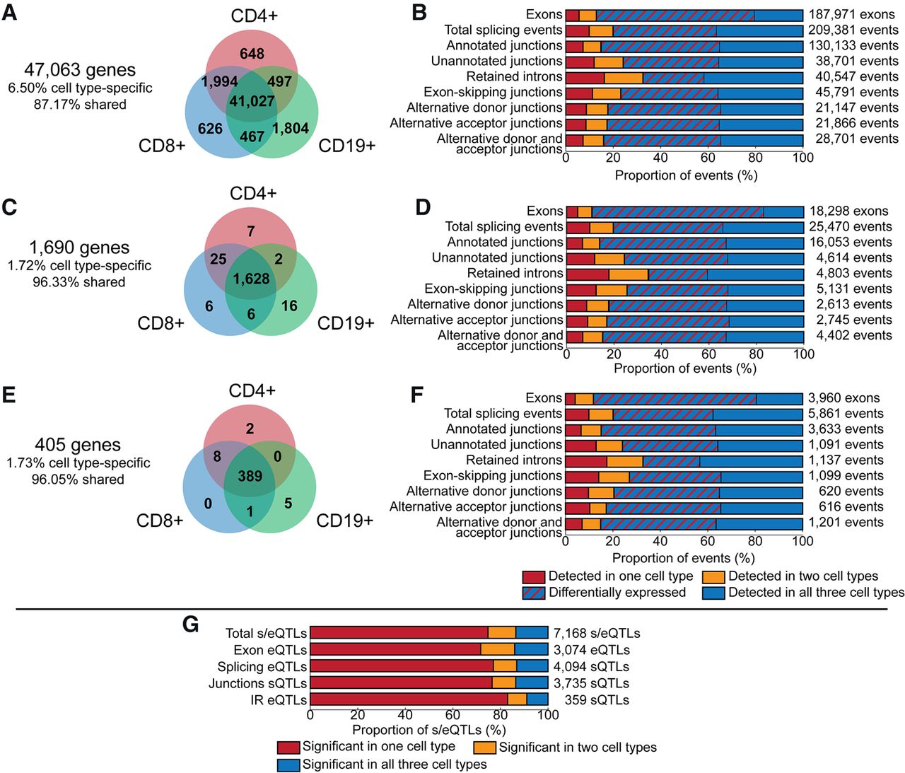 Summary of gene expression and splicing analysis. (A) Genes expressed in CD4+ T cells (red), CD8+ T cells (blue), and CD19+ B cells (green). (B) Proportion of detected exons and splicing events of all genes expressed in at least two cell types in one cell type (red), two cell types (yellow), and all three cell types (blue). The proportion of exons and AS events detected in all three cell types and quantitatively different in at least one cell type is indicated by red hatching. (C) Autoimmune candidate genes expressed in CD4+ T cells, CD8+ T cells, and CD19+ B cells. (D) Proportion of detected exons and splicing events of autoimmune candidate genes expressed in one cell type (red), two cell types (yellow), and all three cell types (blue). (E) T1D candidate genes expressed in CD4+ T cells, CD8+ T cells, and CD19+ B cells. (F) Proportion of detected exons and splicing events of T1D candidate genes expressed in one cell type (red), two cell types (yellow), and all three cell types (blue). (G) cis-eQTL and sQTL in autoimmune disease candidate genes for exons and splicing events detected in all three cell types. The proportion of s/eQTL significant (FDR P < 0.05) in one cell type (red), two cell types (yellow), and all three cell types (blue).