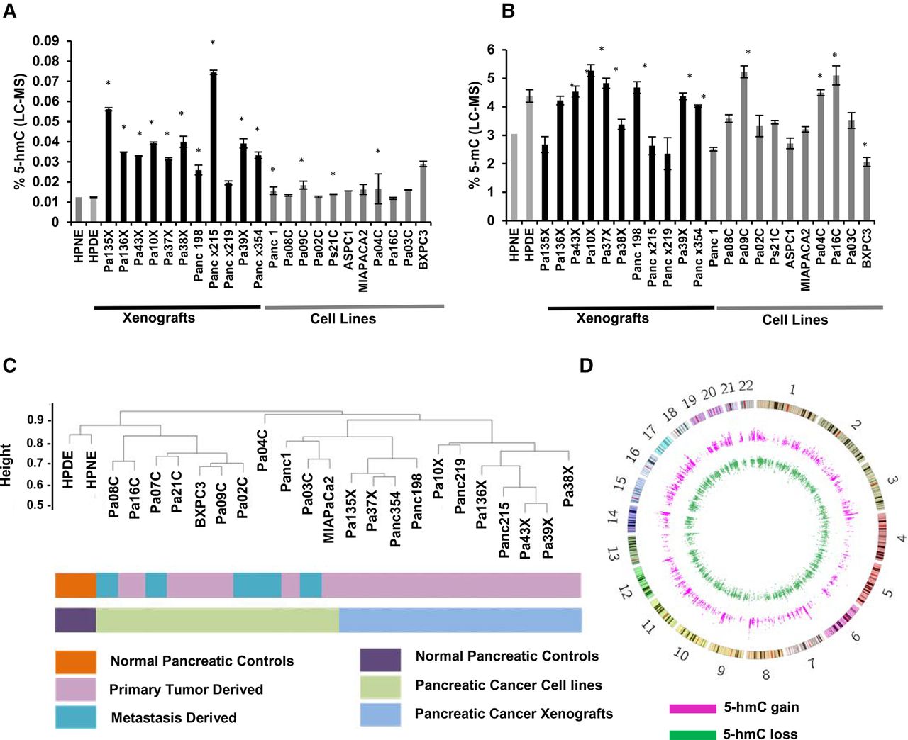 Altered patterns of hydroxymethylation are seen in pancreatic cancer cell lines and primary xenografts. Total 5-hmC (A) and 5-mC (B) levels were measured by LC-MS in pancreatic cancer cell lines primary xenograft tumors and immortalized healthy pancreatic controls (HPNE, HPDE, gray). Values are expressed as a percentage of total cytosine. (*) P-value <0.05 when compared to HPNE, t-test. (C) Unsupervised clustering based on 5-hmC peaks demonstrates dissimilarity between controls and pancreatic cancer cells. (D) Circos plot (Krzywinski et al. 2009) shows genome-wide distribution of regions that gain and lose 5-hmC in pancreatic cancer cells.