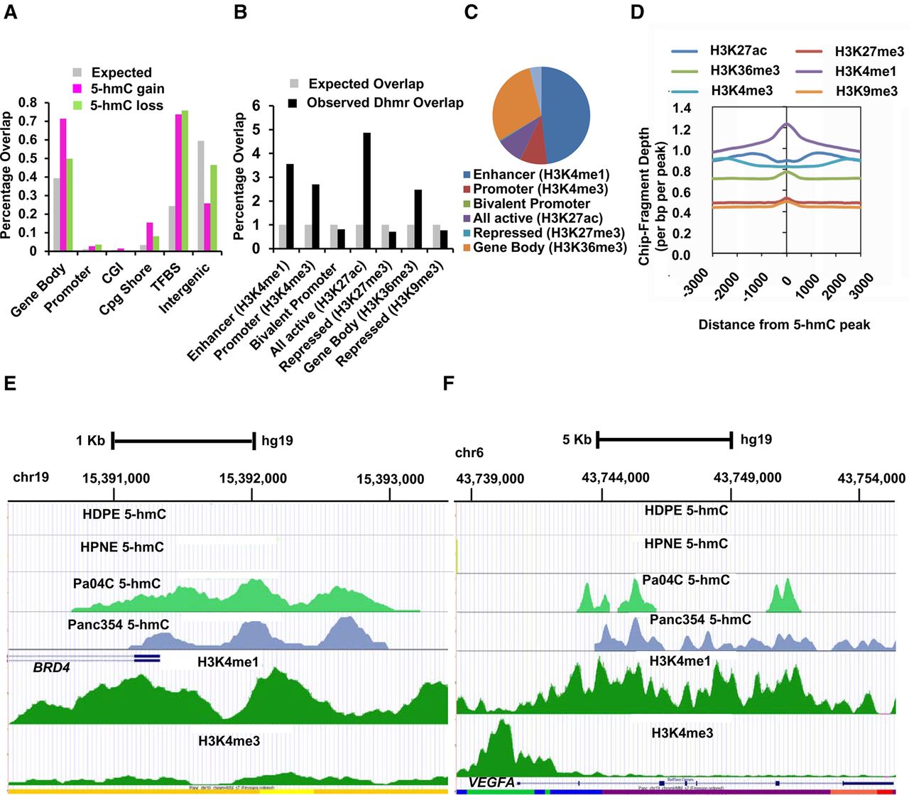 Pancreatic cancer cells acquire changes in 5-hmC at regulatory regions of the genome. (A) Common regions of 5-hmC gain and loss in pancreatic cancer occur significantly at gene bodies, promoters, and transcription factor binding sites. Gains/losses compared with expected genomic distribution (P-value <0.05). (B) Overlap of differentially hydroxymethylated regions in cancer (DHMR) with pancreatic histone marks shows enrichment at H3K4me1, H3K4me3, and other regulatory regions. (C) Distribution of differentially hydroxymethylated peaks shows most overlap with H3K4me1 regions. (D) Overlap of 5-hmC peaks with histone modifications shows spatial overlap with H3K4me1 regions. (E) BRD4 gene locus shows acquisition of 5-hmC peaks in pancreatic cancer cell line (Pa04C) and Xenograft (Panc354) around the promoter with strong overlap with H3K4me1 peaks. No 5-hmC peaks were seen in two healthy controls (HDPE, HPNE). (F) VEGFA gene locus shows acquisition of 5-hmC peaks in gene body with strong overlap with H3K4me1 peaks.