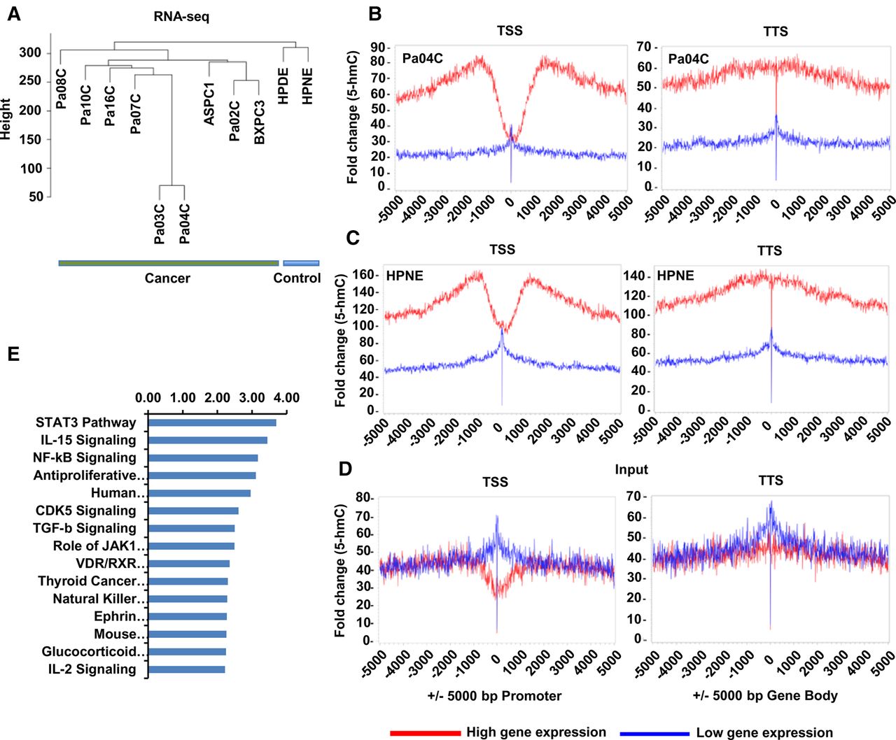 5-hmC correlates with gene expression in pancreatic cancer and regulates oncogenic pathways. (A) Unsupervised clustering based on gene expression profiling by RNA-seq of pancreatic cancer and pancreatic cancer cells are transcriptionally distinct from controls. (B,C) 5-hmC loci were mapped relative to RefSeq transcripts expressed at different levels in pancreatic cells as obtained from RNA-seq analysis. RefSeq transcripts were divided into two bins based on gene expression level and 5-hmC regions centered on transcription start sites or end sites. (B,C) Enrichment of 5-hmC is seen in highly expressed genes in both controls and cancer cells. (D) Input controls are shown. (E) Differentially expressed genes that are associated with corresponding changes in 5-hmC are grouped in functional pathways by the ingenuity pathway tool.