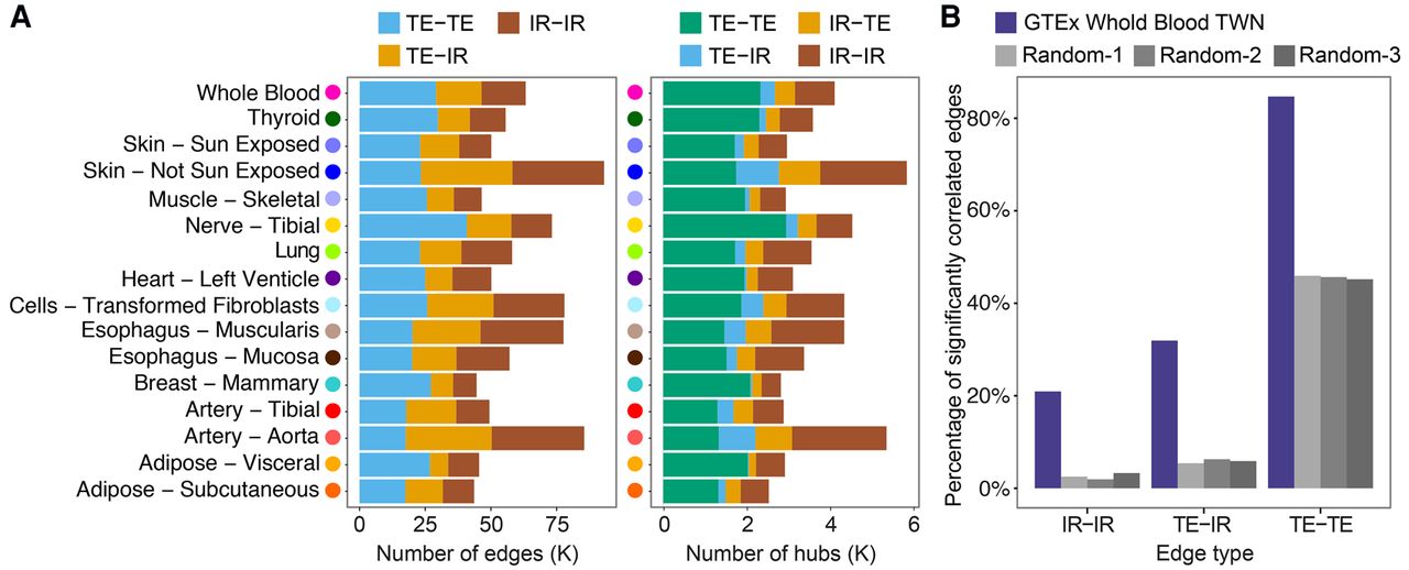 GTEx Transcriptome-Wide Networks summary and replication. (A) For each tissue, number of edges and number of hub nodes (≥10 neighbors), segmented by the type of nodes connected by each edge. A “TE-IR” hub is a TE node with multiple IR neighbors, and an “IR-TE” hub is an IR node with multiple TE neighbors. (B) Fraction of whole blood TWN edges replicating in an independent RNA-seq data set (DGN) (Battle et al. 2014; Mostafavi et al. 2014).
